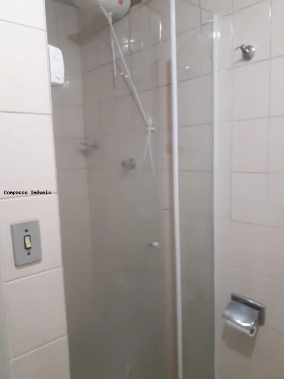 Banhiero com Box e chuveiro, mias gabinete de pia.