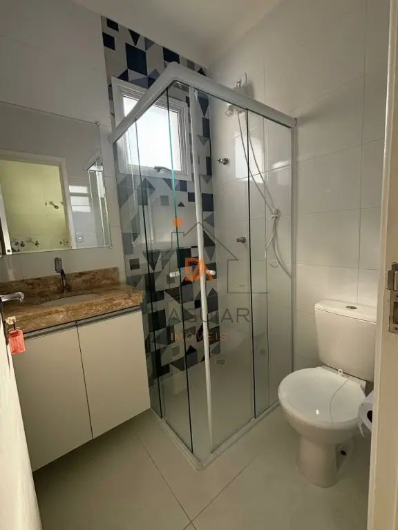 Banheiro com gabinete, espelho, metais, assento sanitário, chuveiro e box em vidro.