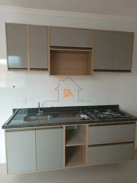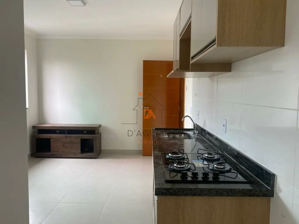 Cozinha equipada com armários (gabinete e aéreos) e cooktop de 4 bocas .