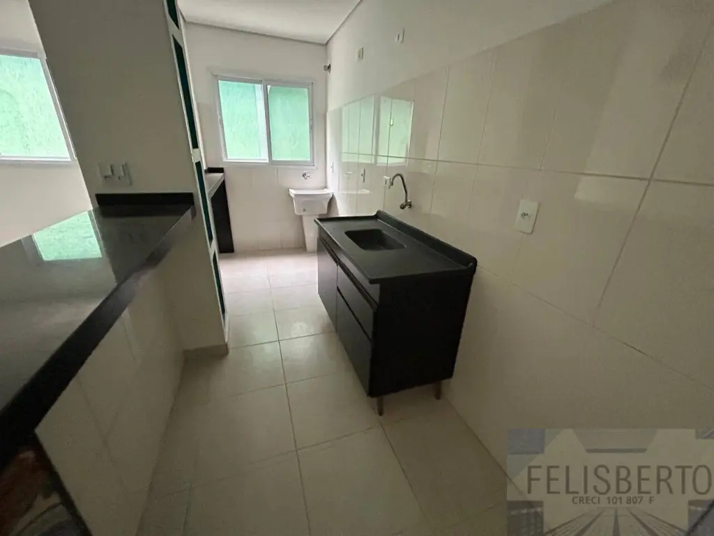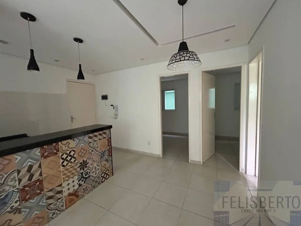 O apartamento possui dois dormito´rios, sala de estar, cozinha, banheiro social e a´rea de servic¸o, ale´m de uma vaga de garagem coberta.