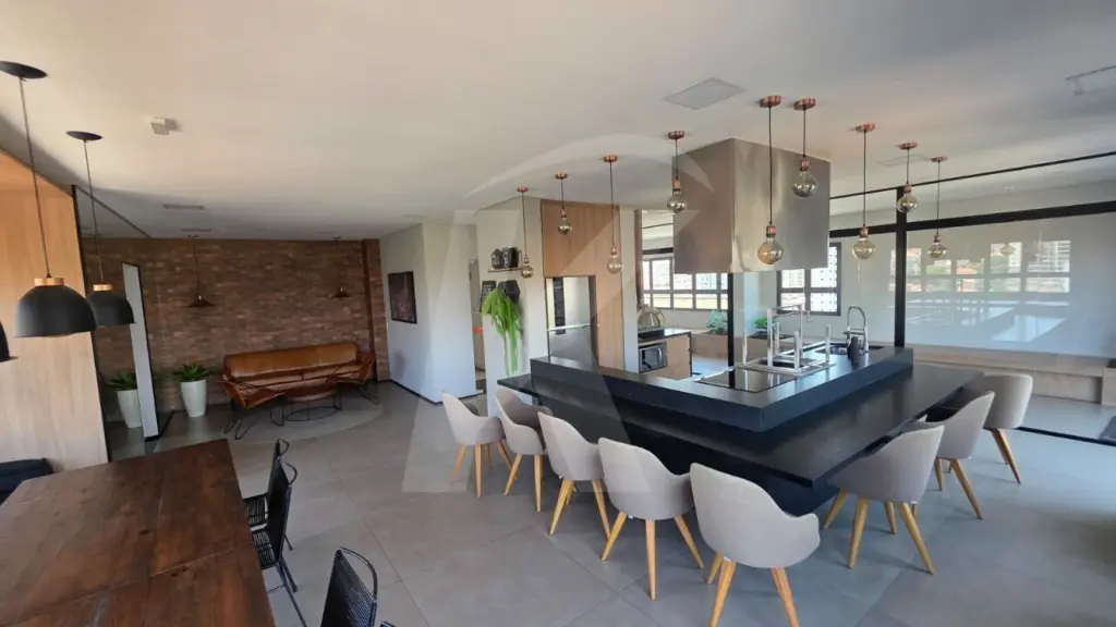Salão de festas com espaço gourmet equipado