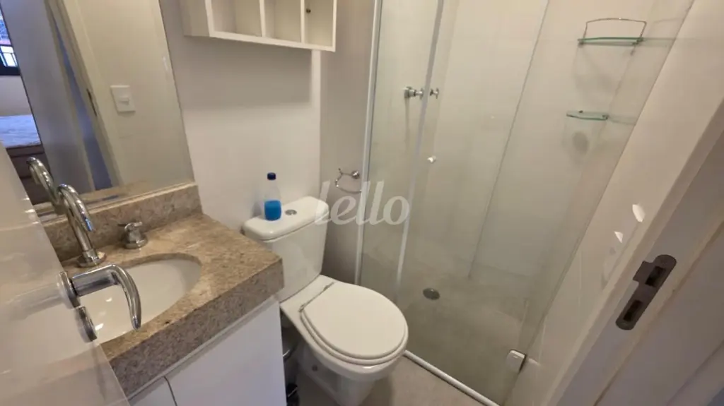 Banheiros com box de vidro, gabinete e espelho.