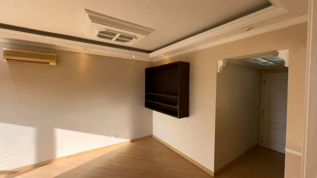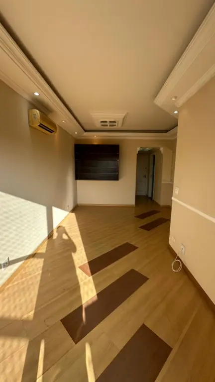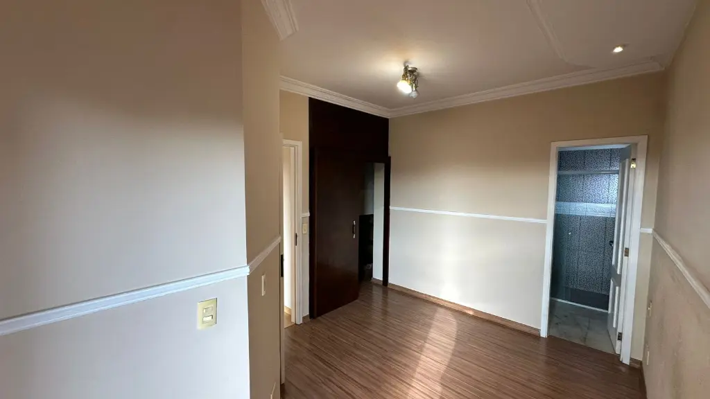 Pisos em madeira/laminado nos quartos e corredor, e um teto estiloso no hall de entrada.