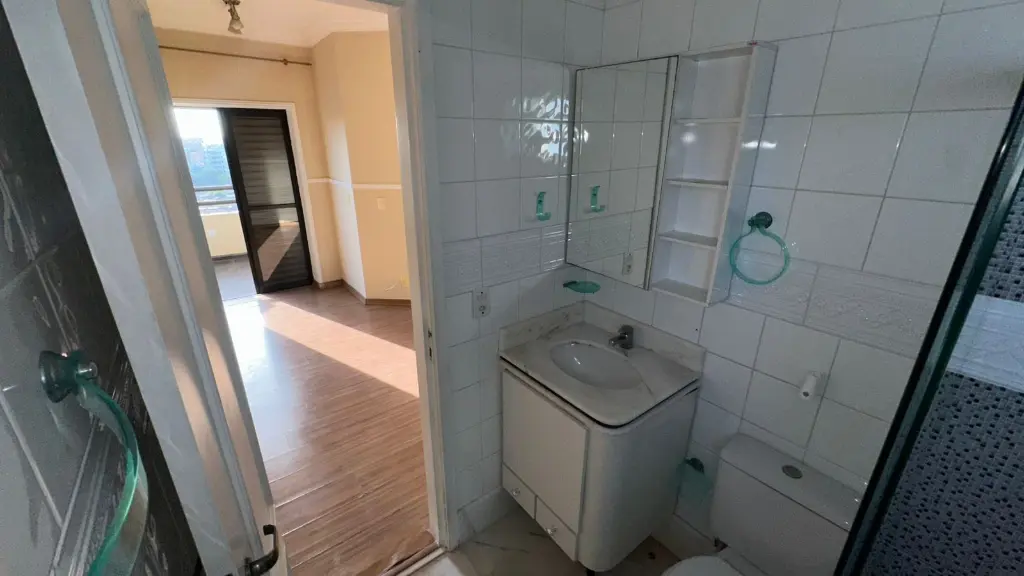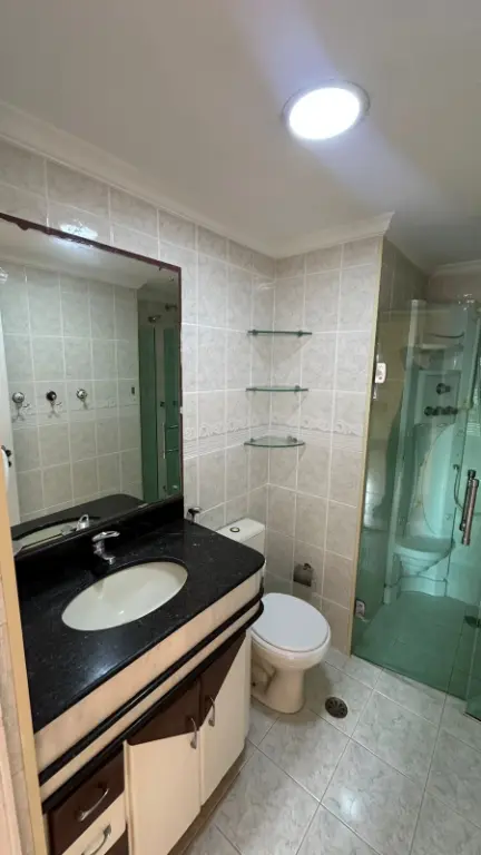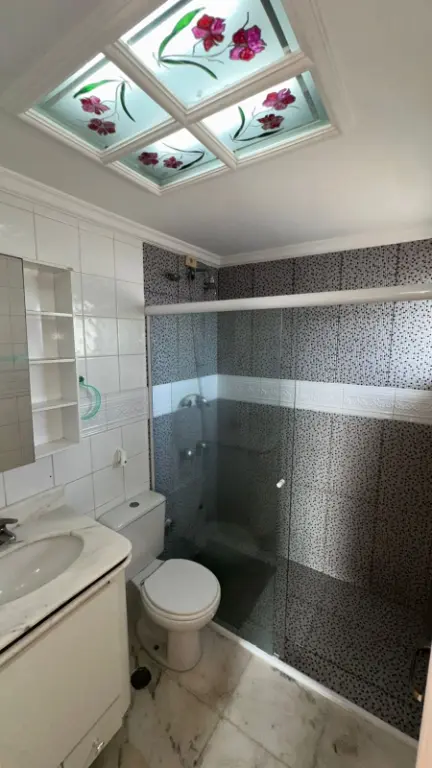 02 Banheiros no total, ambos com armários e 100% azulejados. O banheiro social possui um box de vidro moderno e um lindo teto decorado!