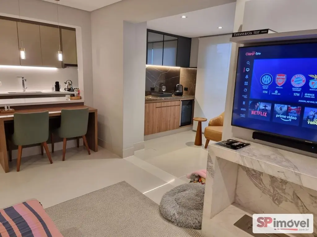 Sala de estar : Ar condicionado quente e frio K7, TV led 60, sofá de 02 lugares reclinável, tapete central, painel da TV embutido sob medida, Sistema de som Soundbar JBL com subwoofer, Cortinas sob medida, mesa de lanches rápido com 02 cadeiras, lareira de granito ecológica.