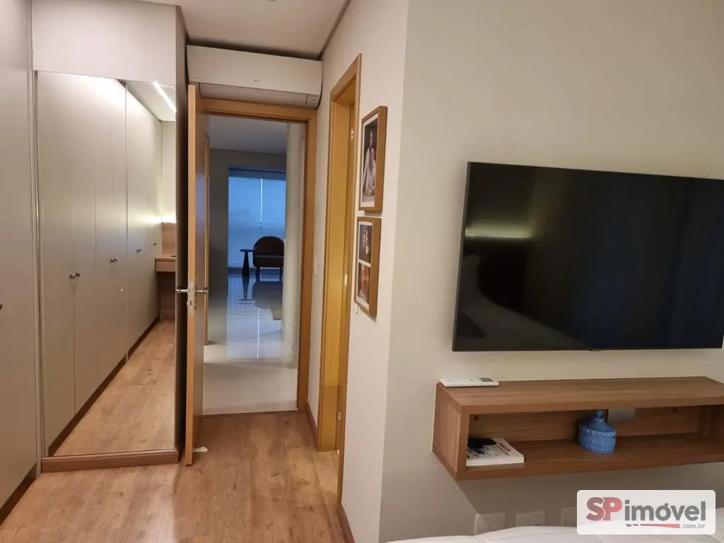 Suíte : Ar condicionado quente e frio split, armários embutidos sob medida, TV Samsung Led 55, com painel, escrivaninha com cadeira e gavetas embutidos sob medida, cortinas sob medida, iluminação de led.