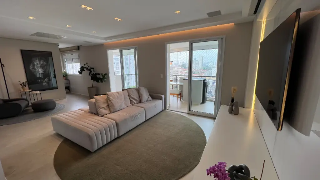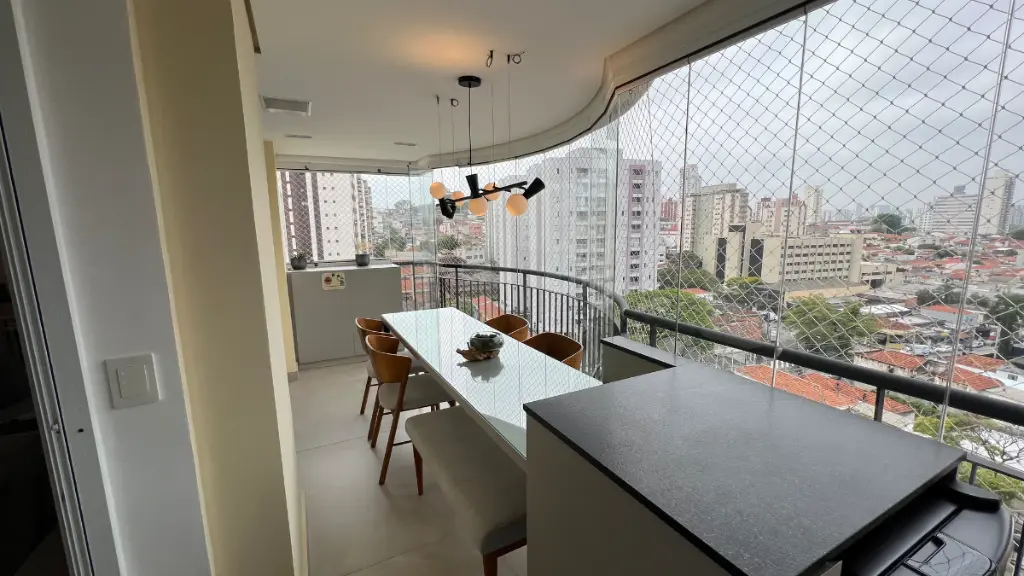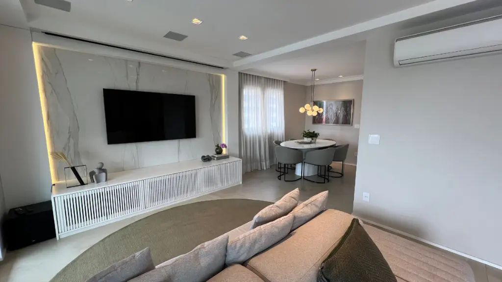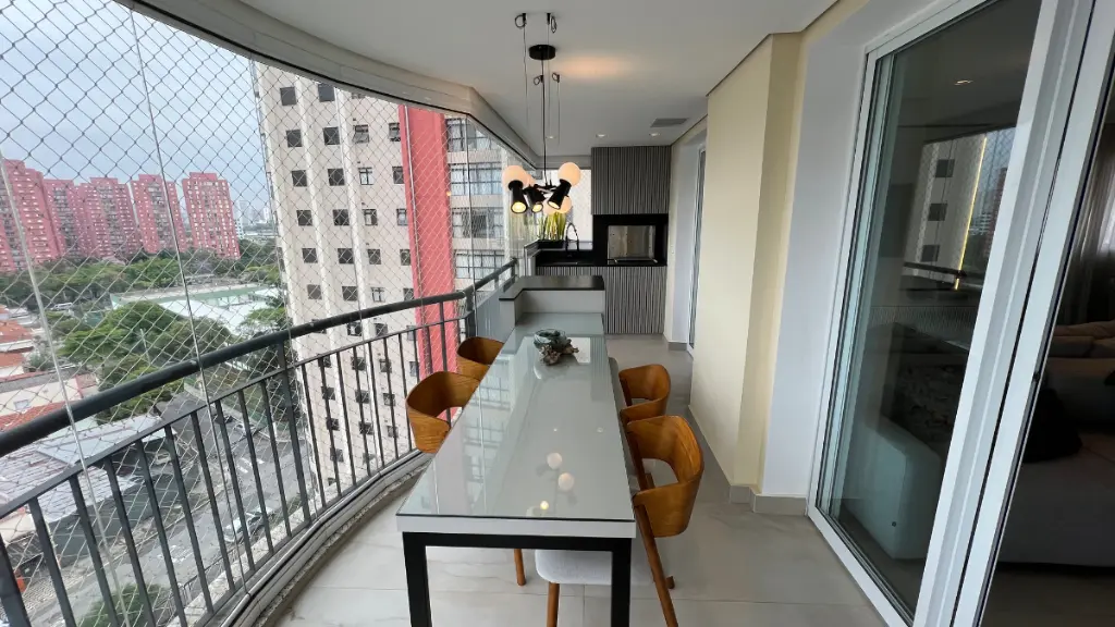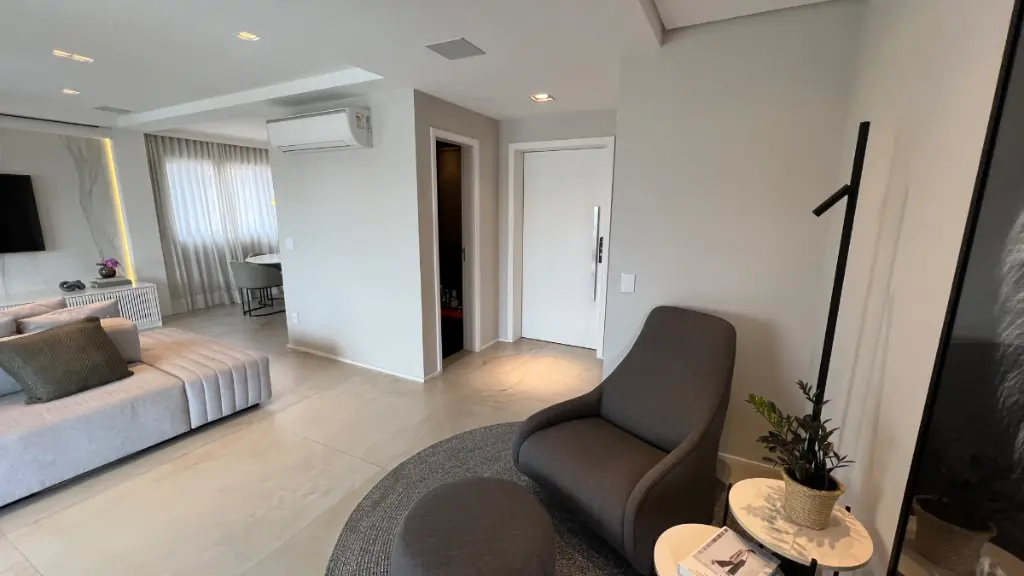 Sala ampla para 3 ambientes, varanda gourmet fechada com cortina de vidro, lavabo, ar condicionado em todos os cômodos, wc de serviço, despensa e lavanderia.