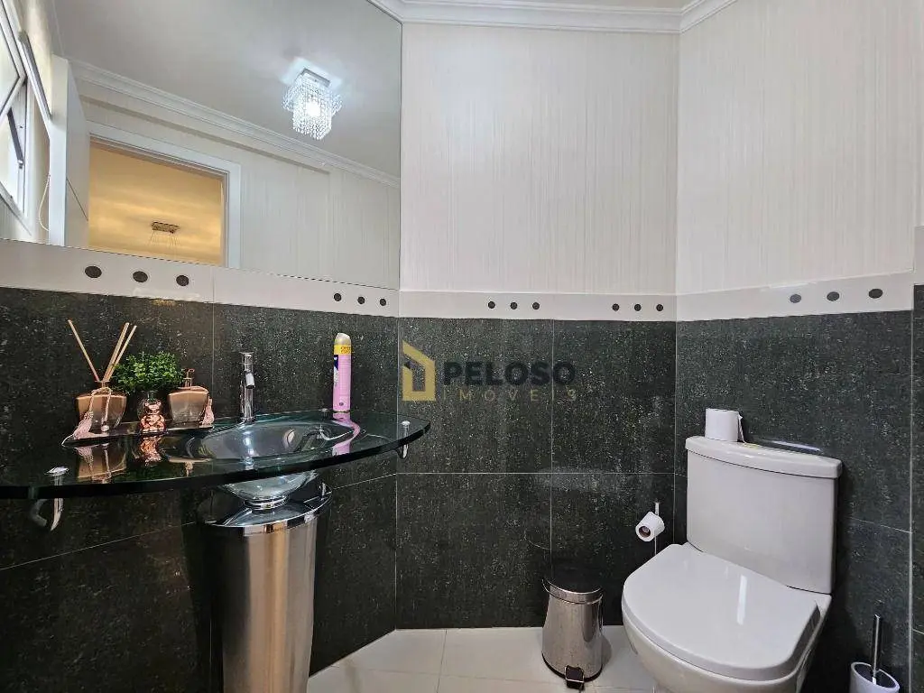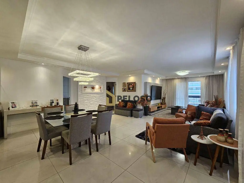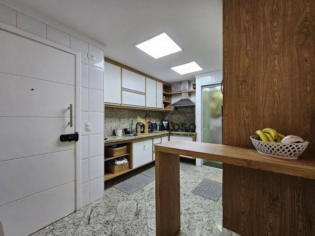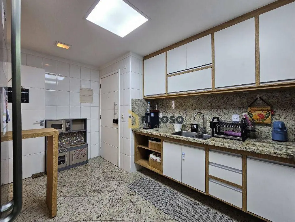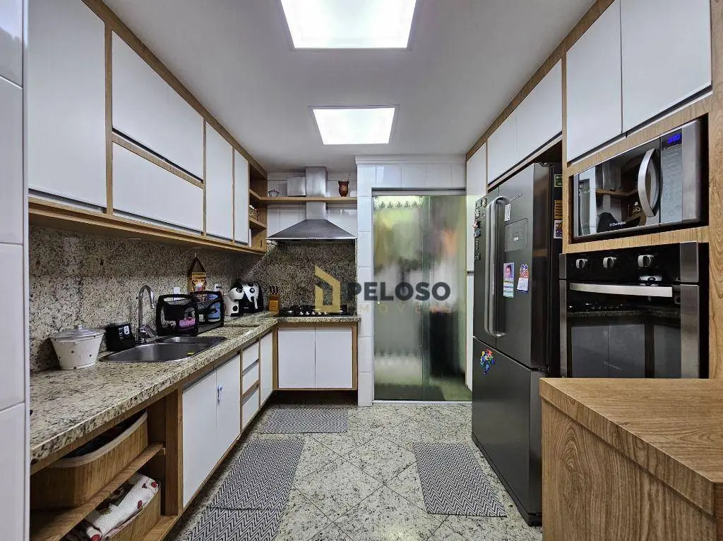 3 suítes com armários (Master contém closet), sala ampla para 3 ambientes, lavabo, varanda gourmet com fechamento em vidro, cozinha equipada com forno, cooktop, coifa e armários, área de serviço com armários, despensa e banheiro.