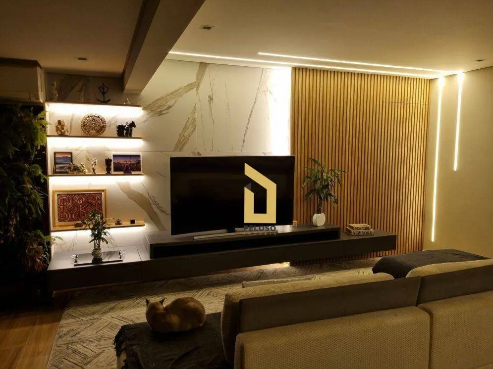 A sala ampliada é integrada à sacada, com piso em porcelanato amadeirado e jardim vertical natural, proporcionando um ambiente moderno e acolhedor.