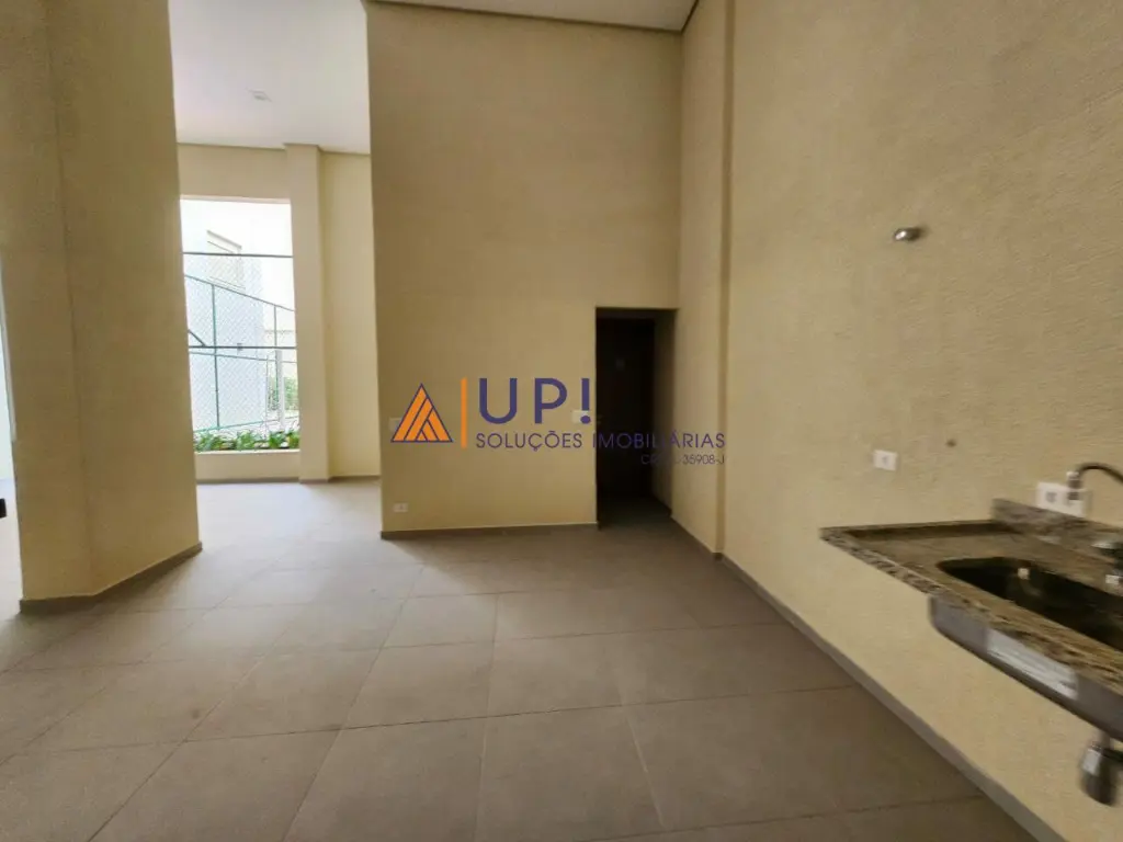 Prédio com área de lazer: salão de festas, academia, área de churrasqueira, piscina, quadra poliesportiva e sauna.