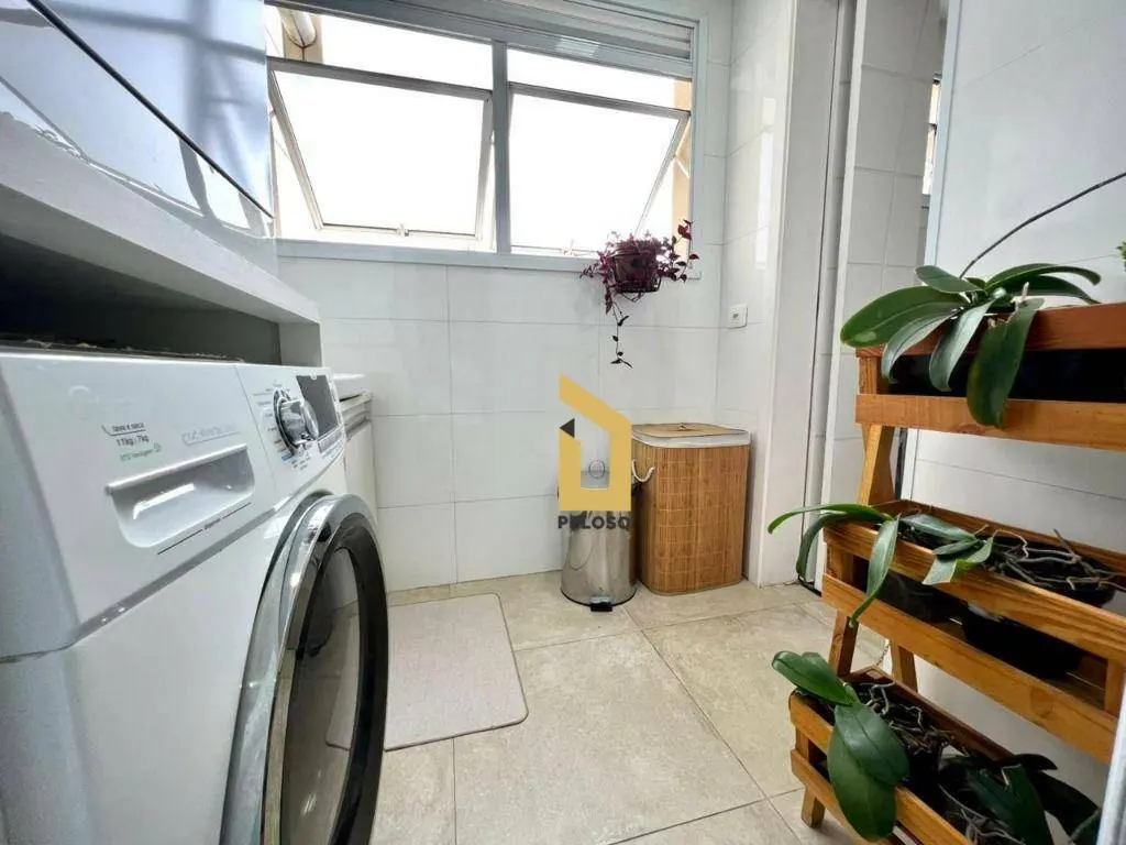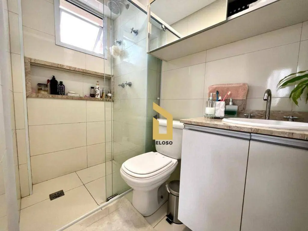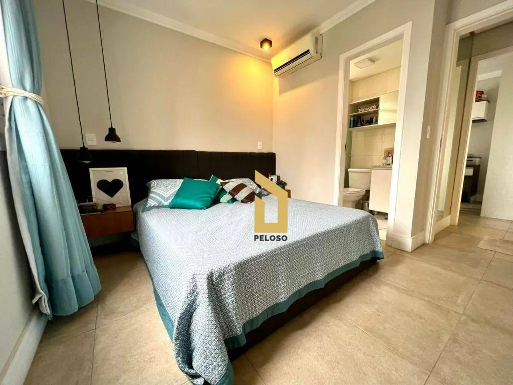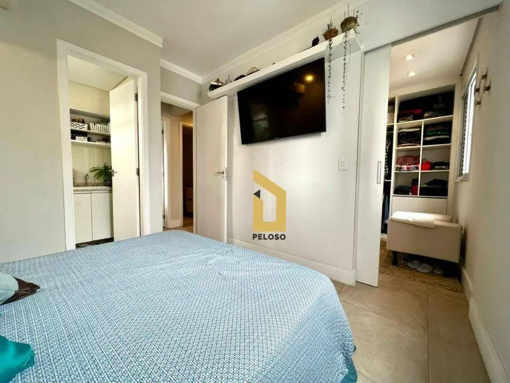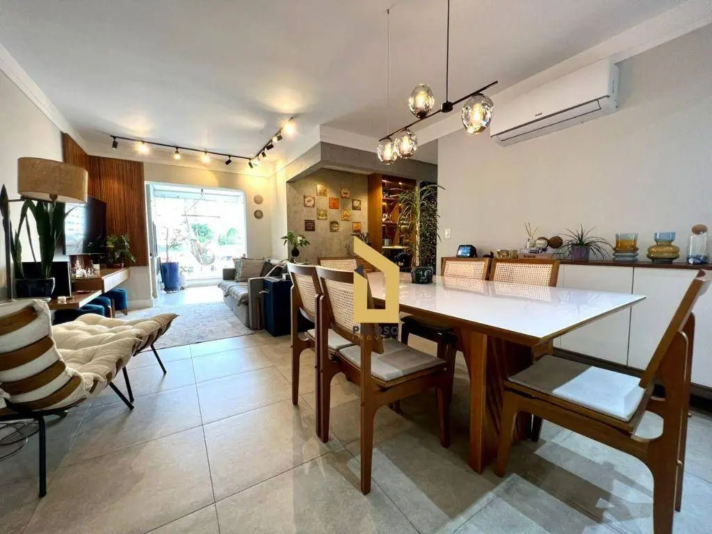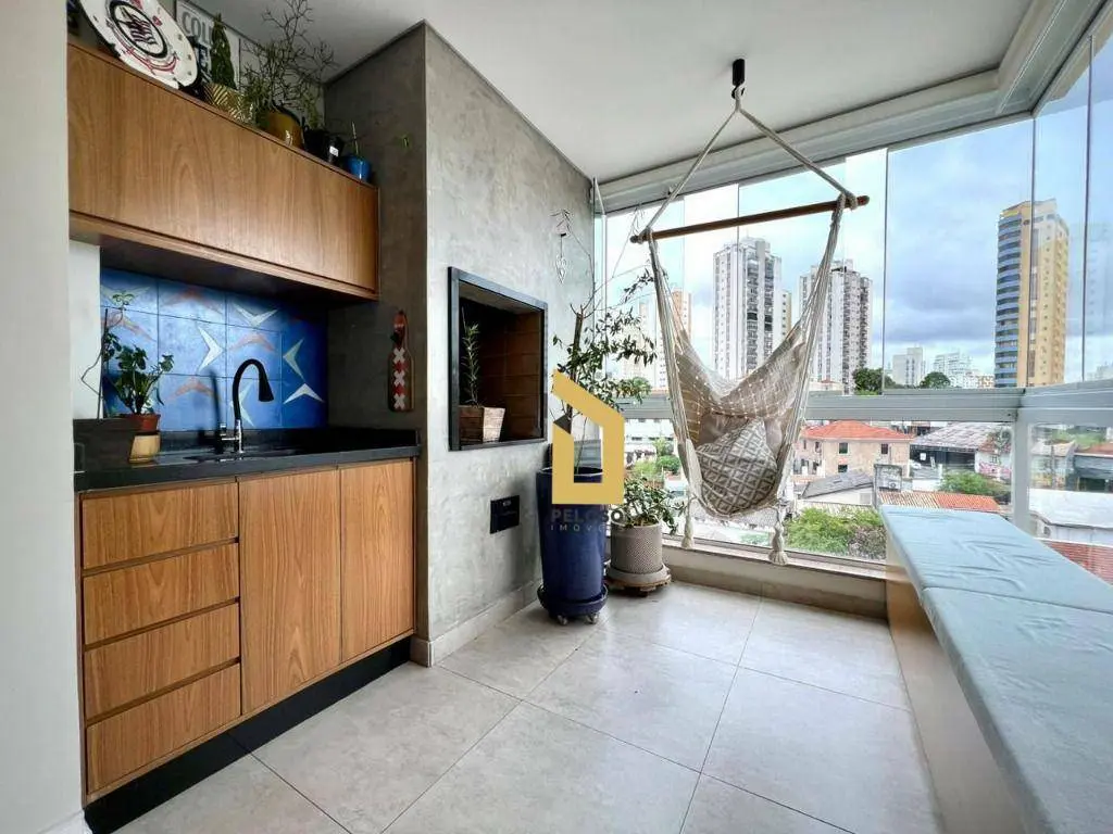 São 88m² com 2 dormitórios sendo uma suíte com closet, banheiro social, sala com dois ambientes com ar condicionado, área gourmet com churrasqueira e fechamento de sacada com envidraçamento, cozinha planejada, lavanderia, despensa e lavabo.