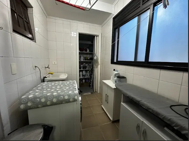 A cozinha e copa, banhadas pela luz natural, conta com diversos armários planejados e área de serviço completa, com quarto e banheiro, além de uma espaçosa despensa.