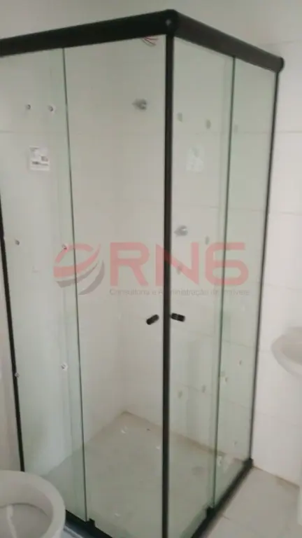 Banheiro com box de vidro e acabamento moderno