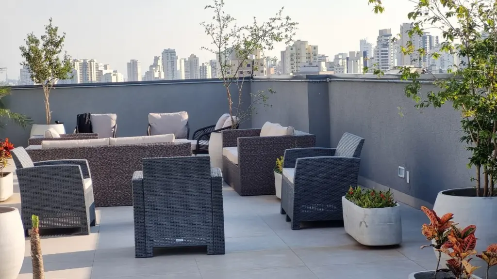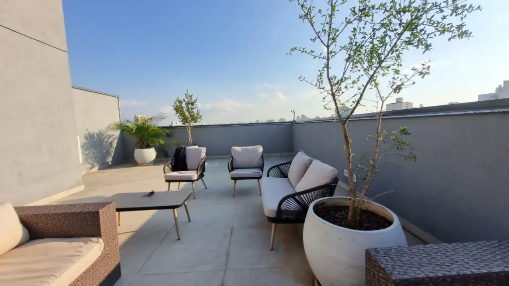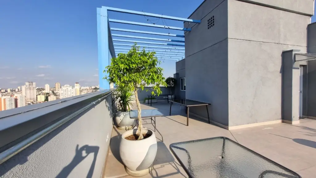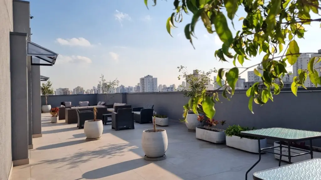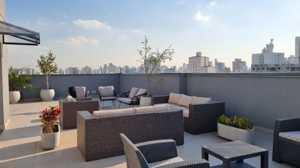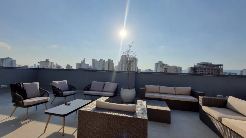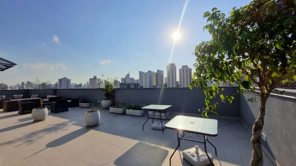 Condomínio conta com academia, lavanderia coletiva, salão de festas no rooftop.