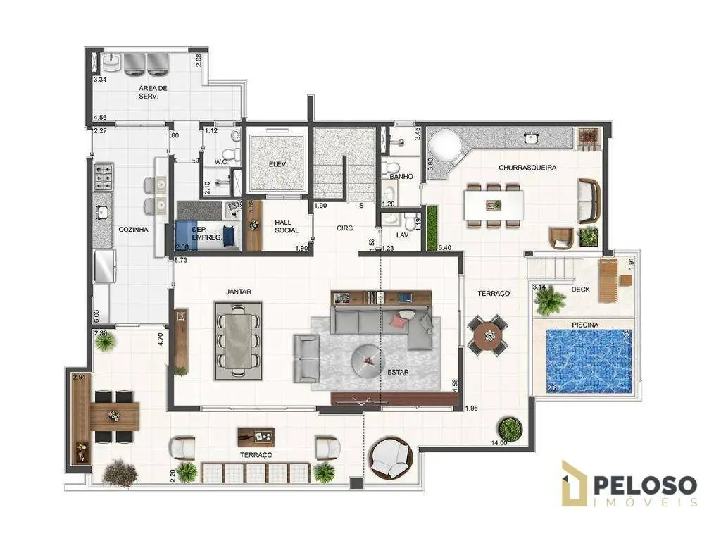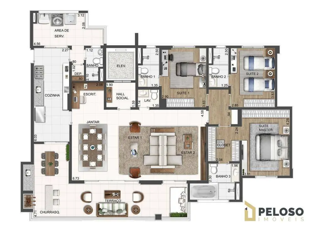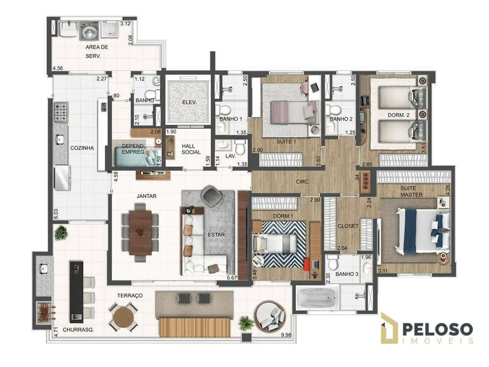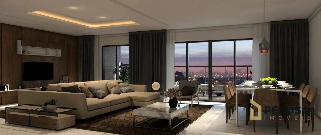 Living para 2 ambientes com varanda gourmet integrada com a cozinha, lavabo, cozinha, dependência de empregada com wc, área de serviço e 4 vagas de garagem