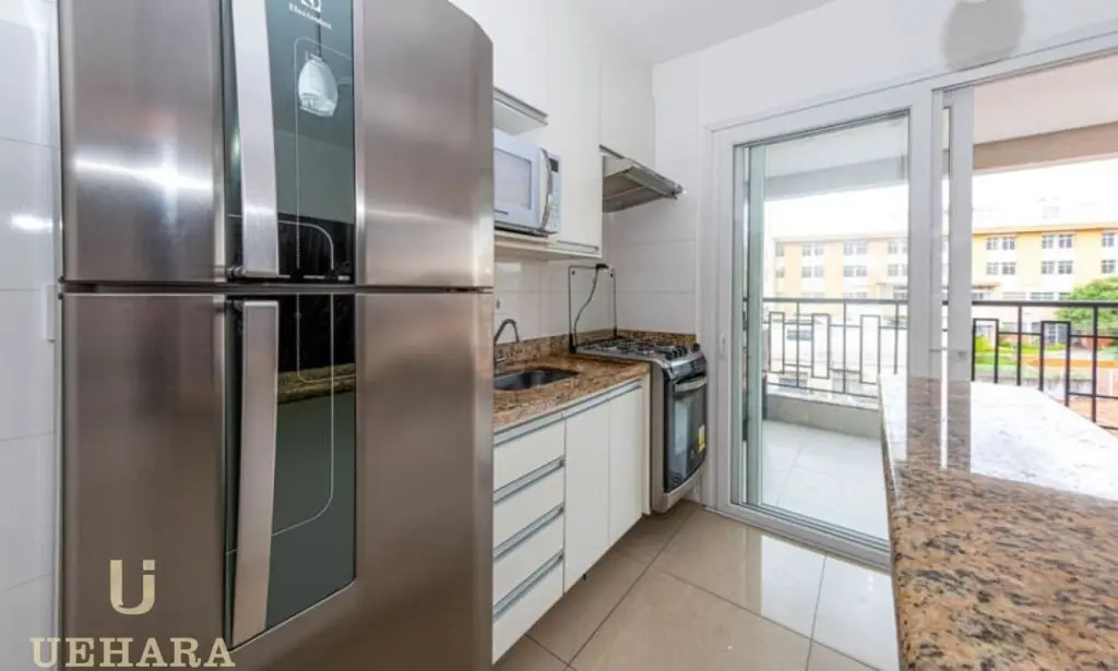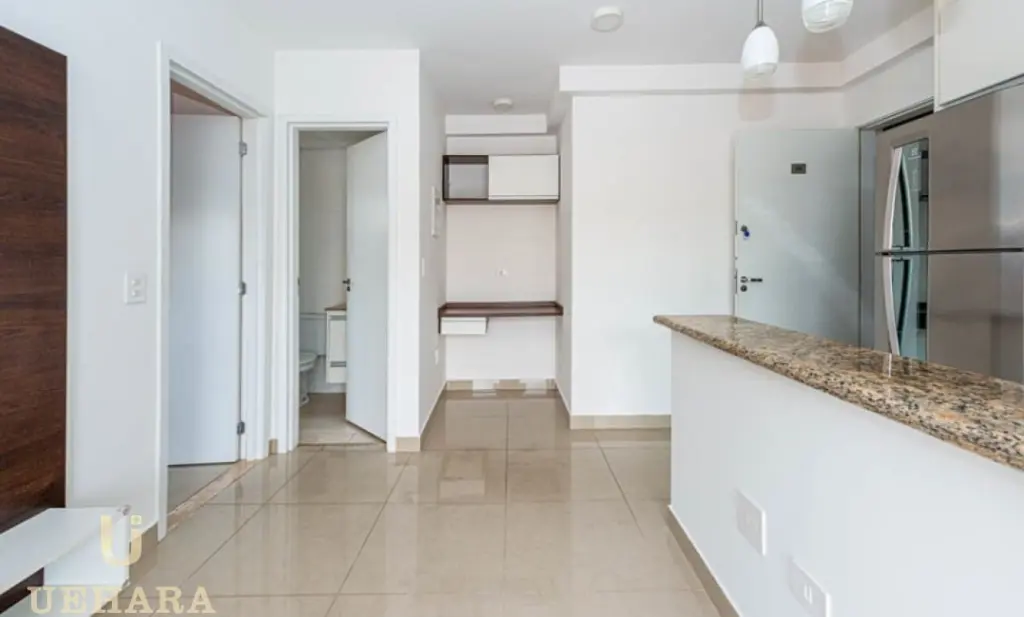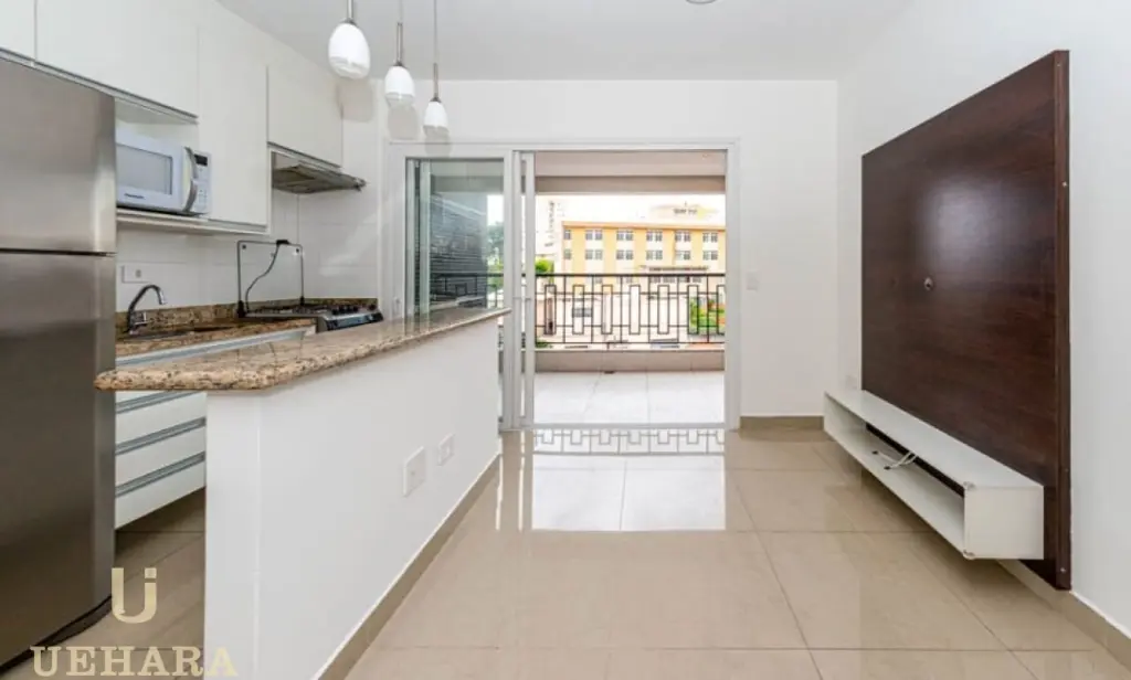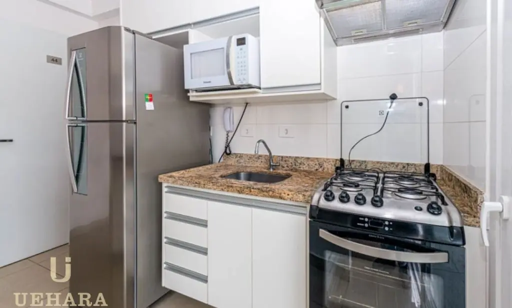 Este Imóvel com 35m², possui 1 dormitório contendo armário, 1 banheiro contendo armário, chuveiro e espelho, sala e cozinha americana com armário embutidos, além de geladeira, micro-ondas e fogão.