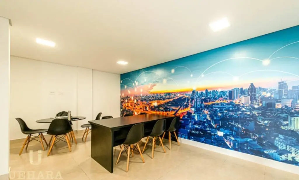 O condomínio oferece piscina, churrasqueira, forno de pizza, academia, espaço coworking, salão de jogos e brinquedotecas