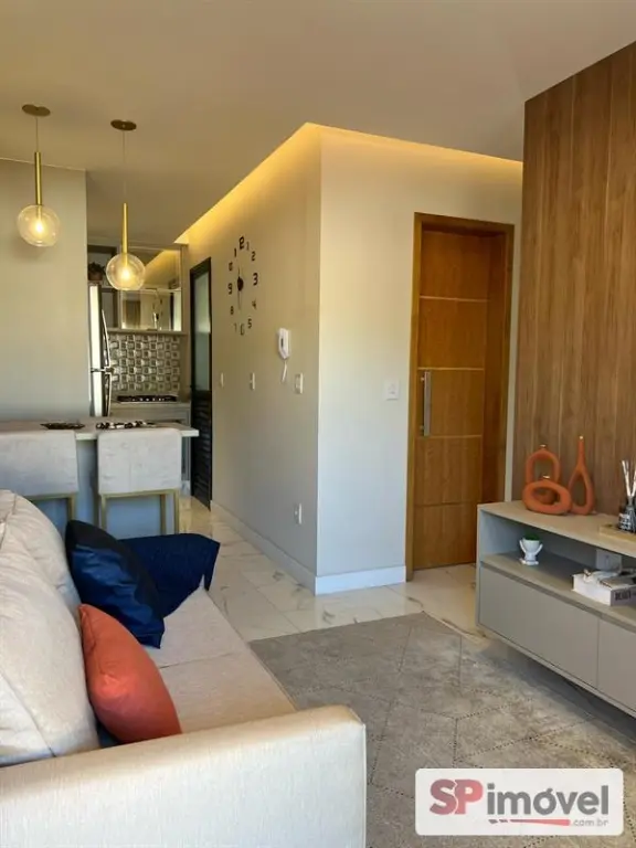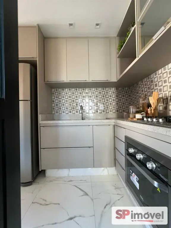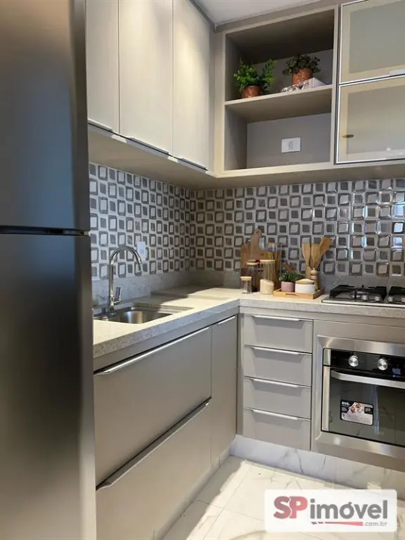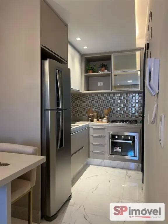 Apartamento de 35m² com 2 dormitórios com armários embutidos, cozinha americana com armários, geladeira, cooktop e forno embutido, está com armários embutidos nos quartos, banheiro, cozinha e lavanderia, box, sofá, camas, colchões e rack para TV além de 1 vaga de garagem.