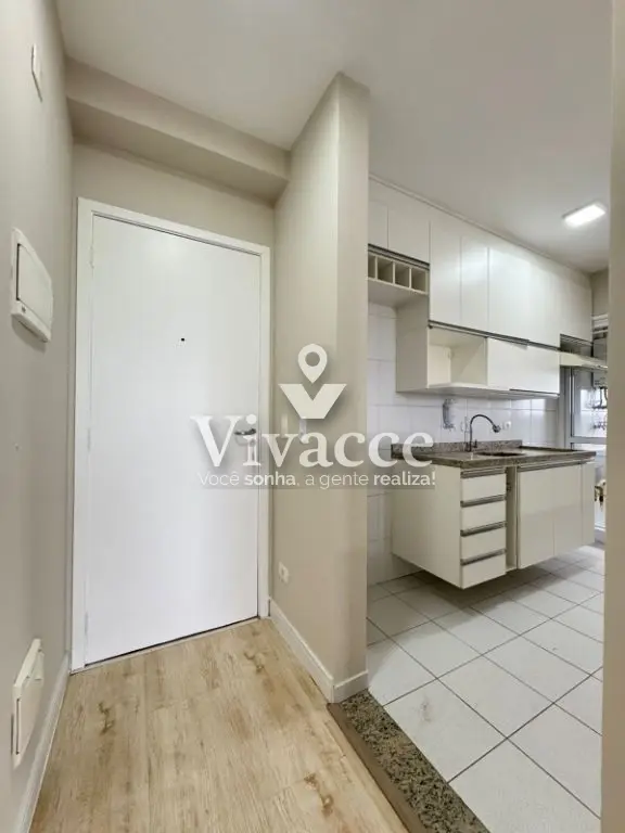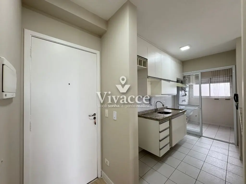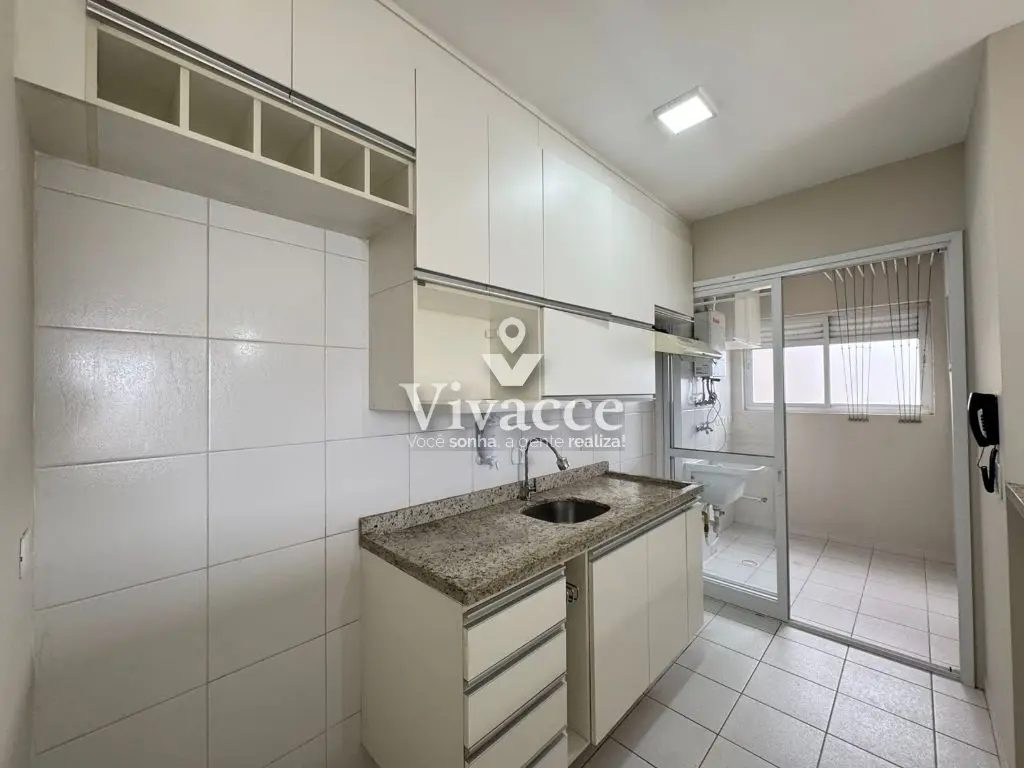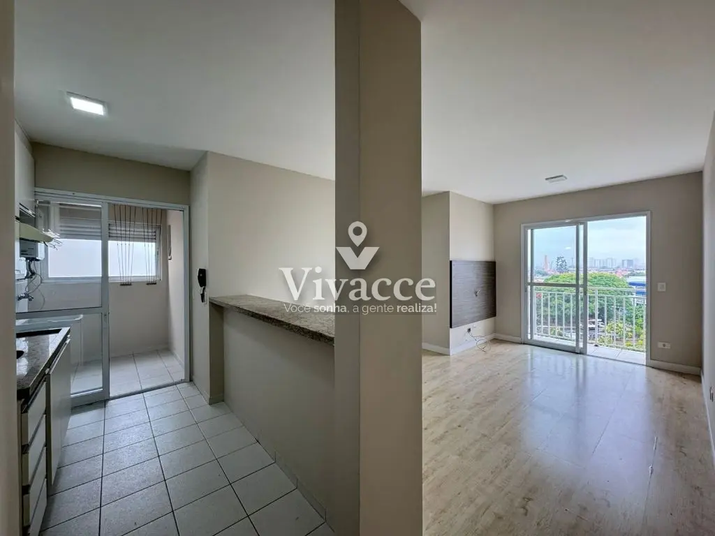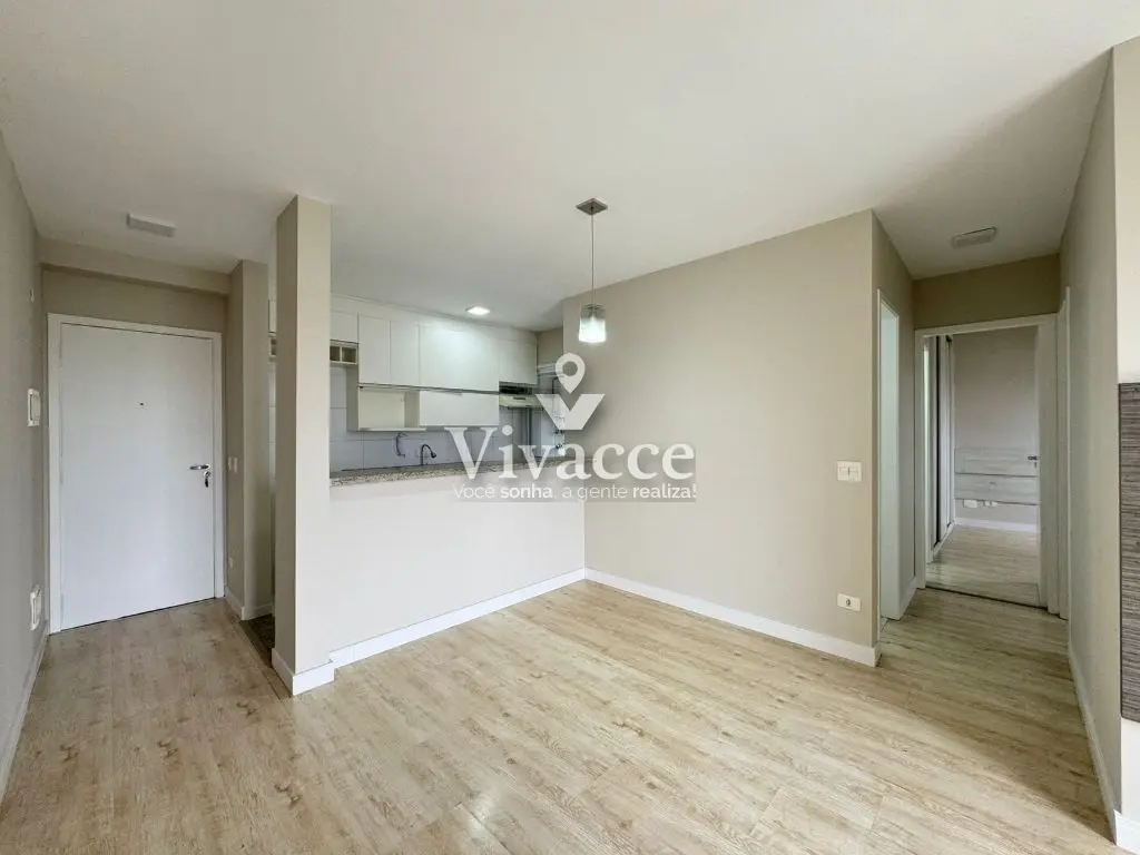 2 dormitórios, sendo 1 suíte, 1 banheiro social, sacada, sala de estar e jantar, cozinha, área de serviço, 1 vaga de garagem coberta presa ( vaga grande com espaço na lateral - sorteio a cada 2 anos ). Piso laminado na sala e dormitórios.