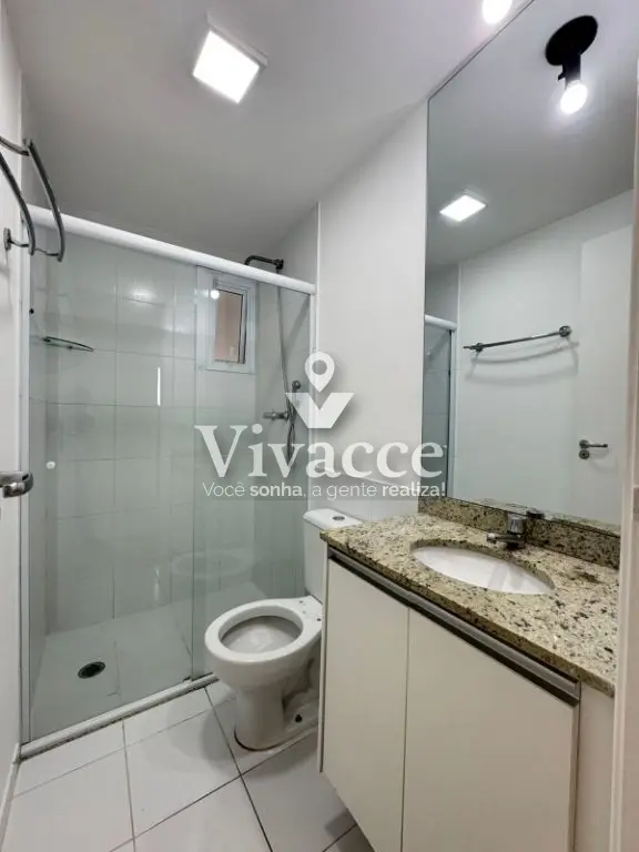 - Banheiros com pia de granito, gabinetes e box de vidro.