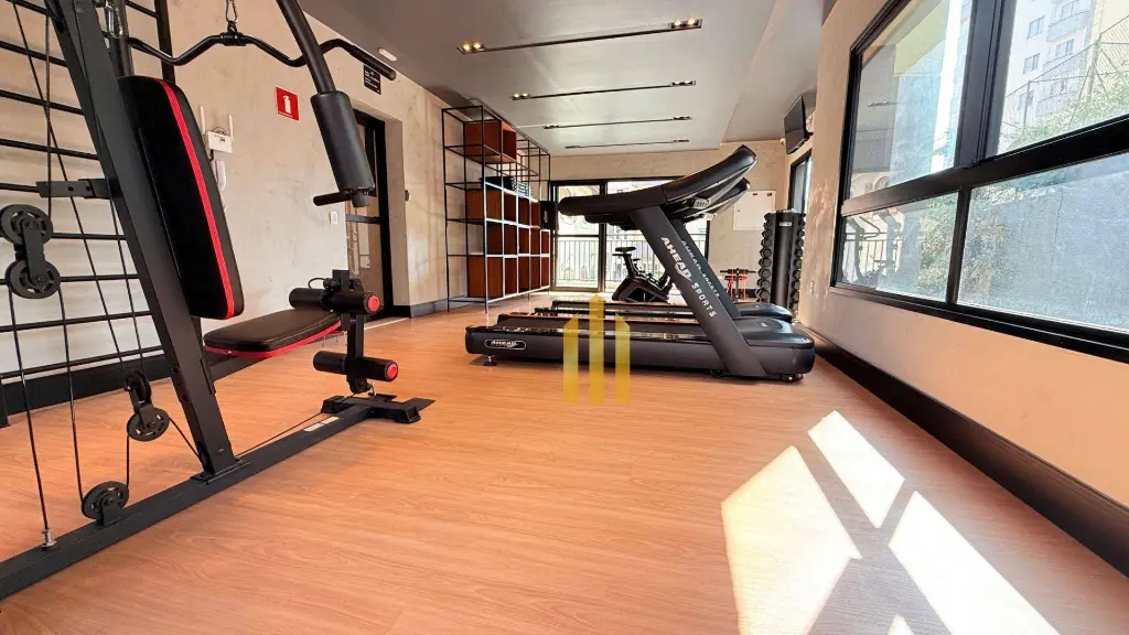 Fitness, academia equipada e espaço para alongamento para cuidar da saúde.