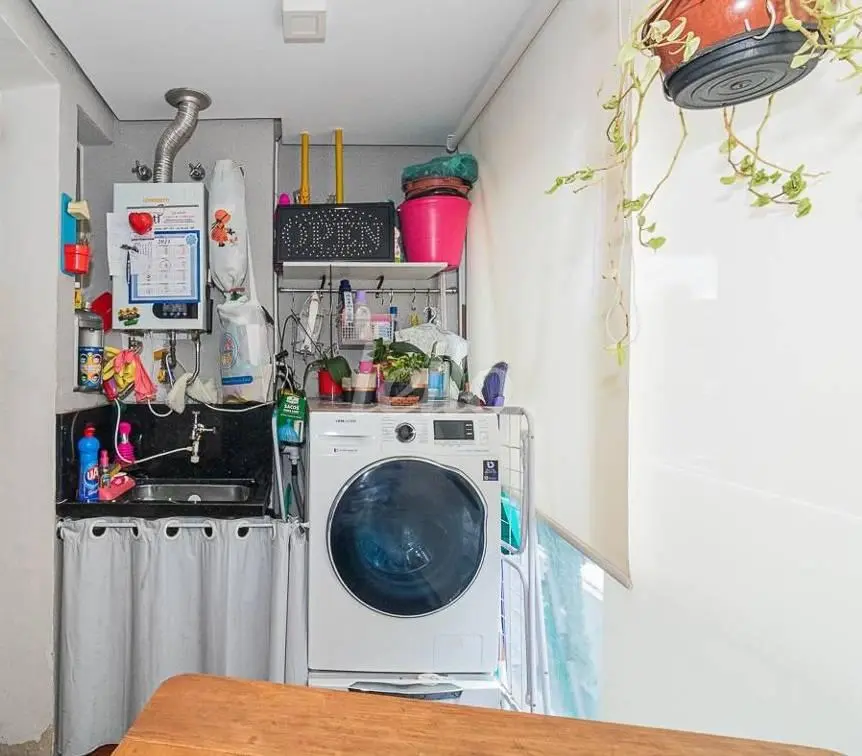 Dois dormitórios sendo uma suíte, sala para dois ambientes, cozinha americana planejada, banheiro social e duas vagas.