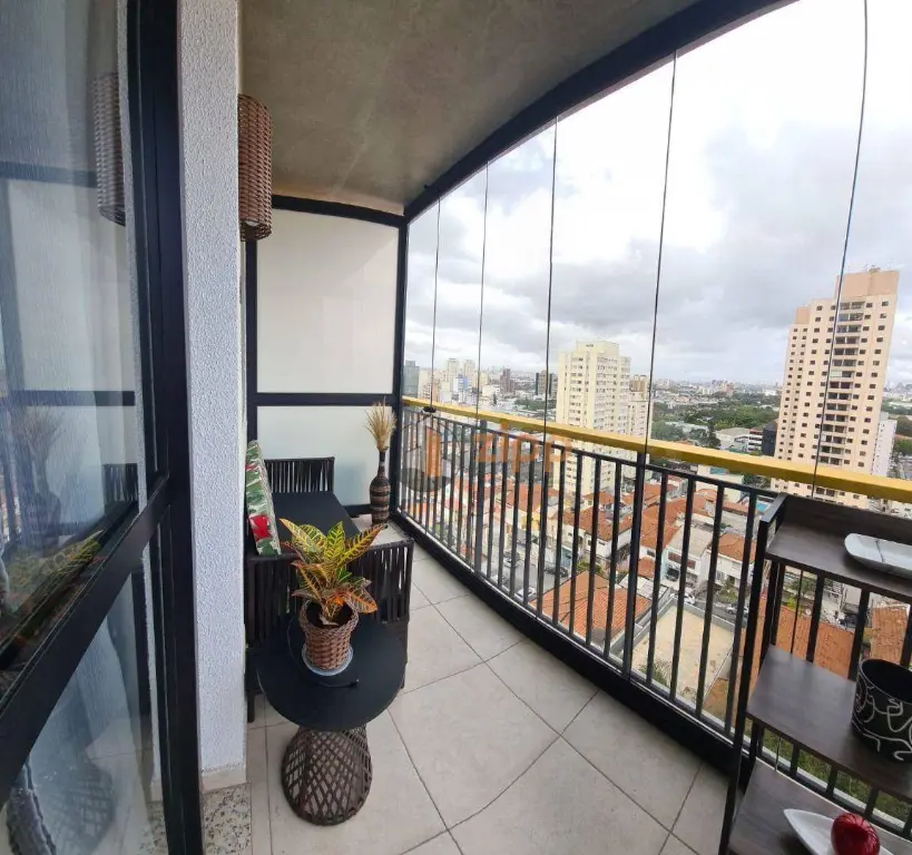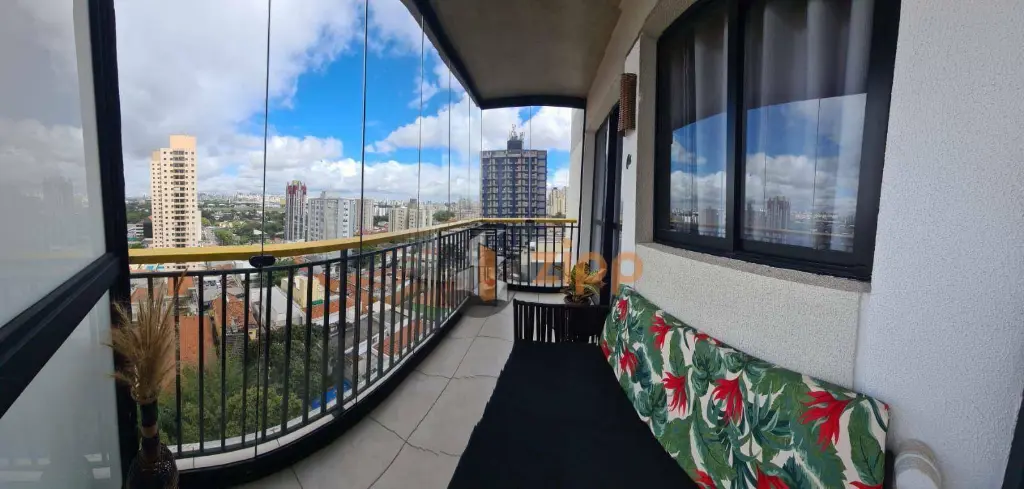 Sacada com fechamento em vidros deslizantes e mobiliada.
