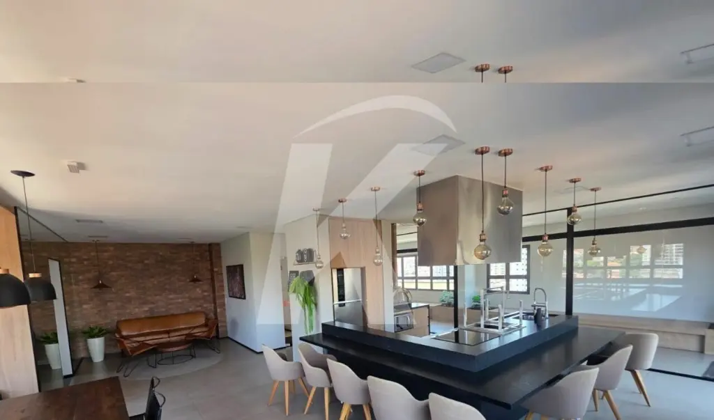 Salão de festas com espaço gourmet equipado