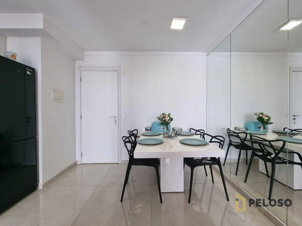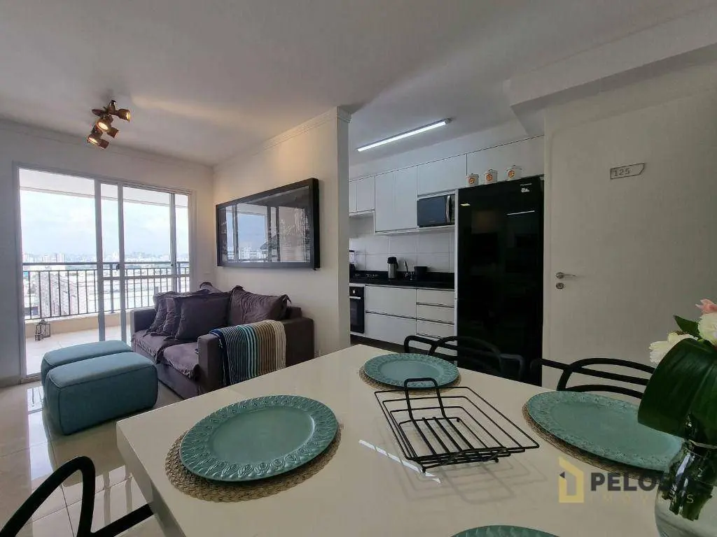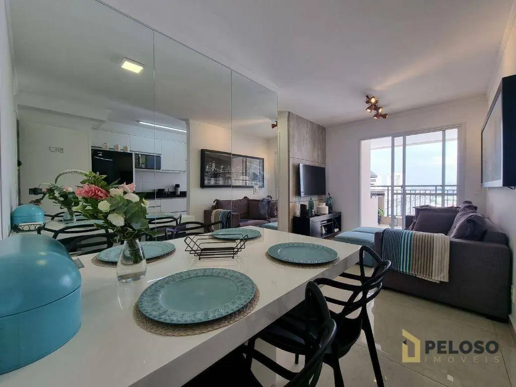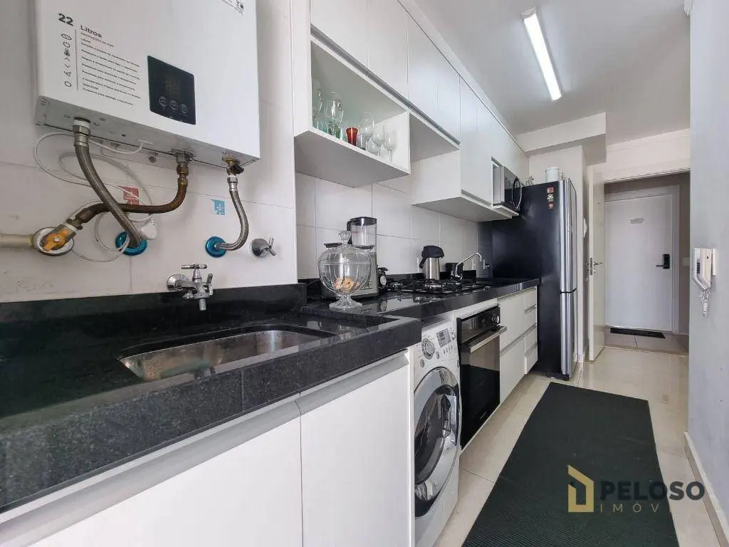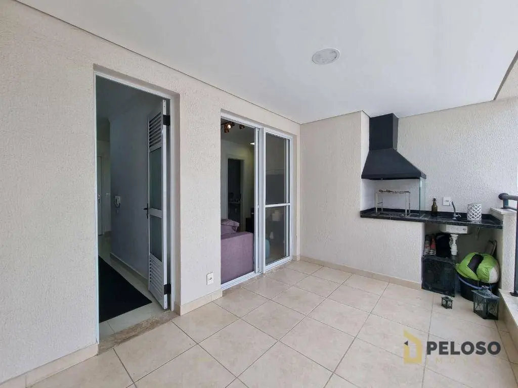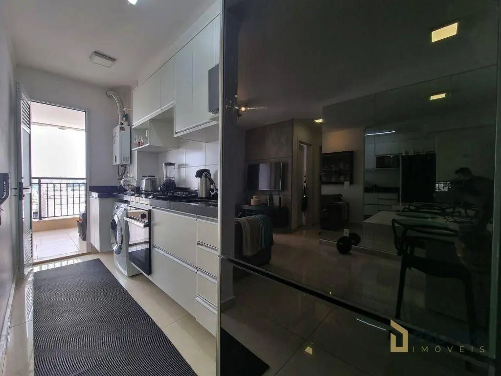 2 dormitórios com armários sendo 1 suíte, banheiro social, sala para 2 ambientes, varanda gourmet, cozinha equipada com forno, cooktop e armários, área de serviço e 1 vaga de garagem fixa.