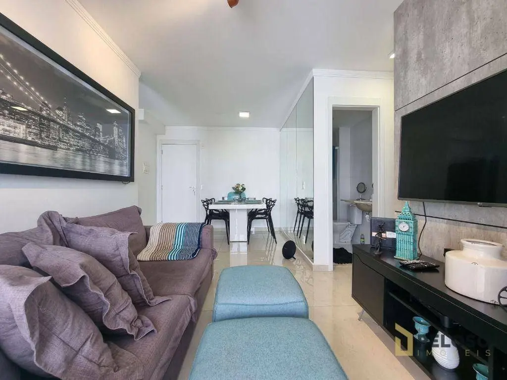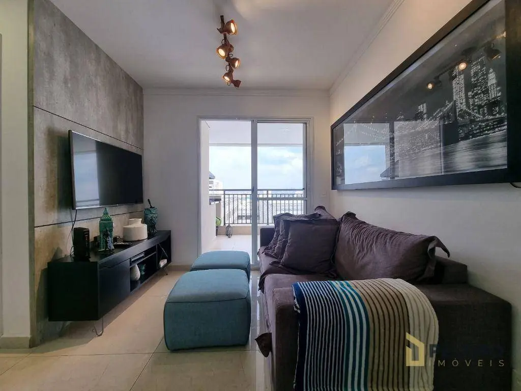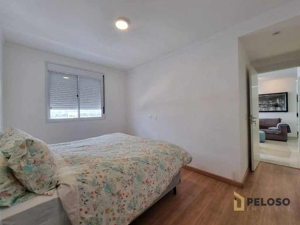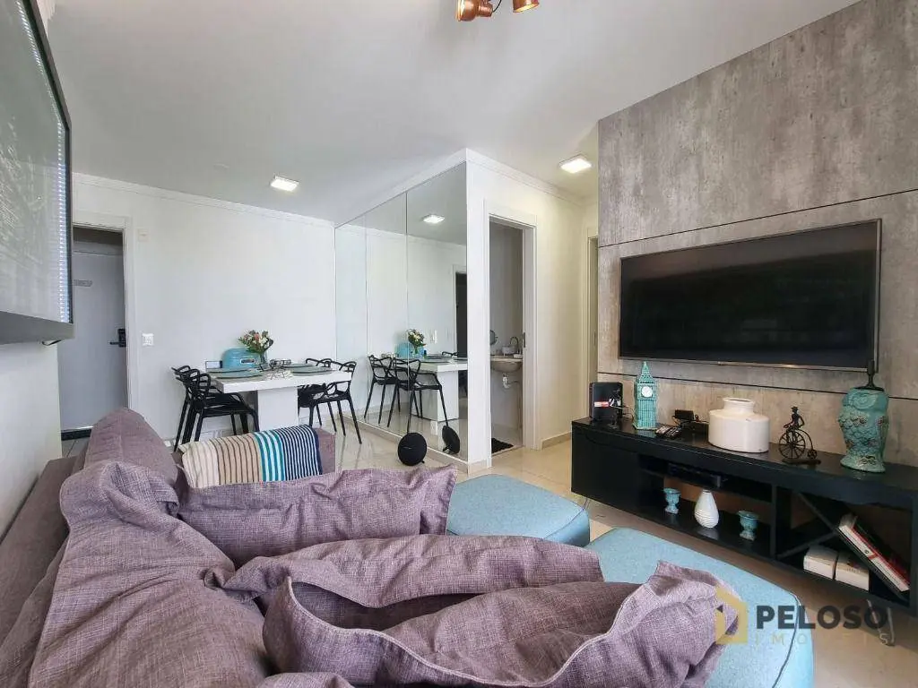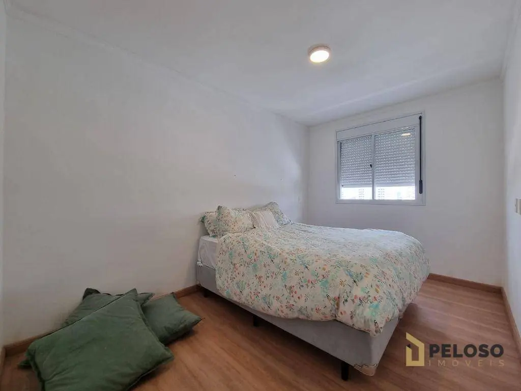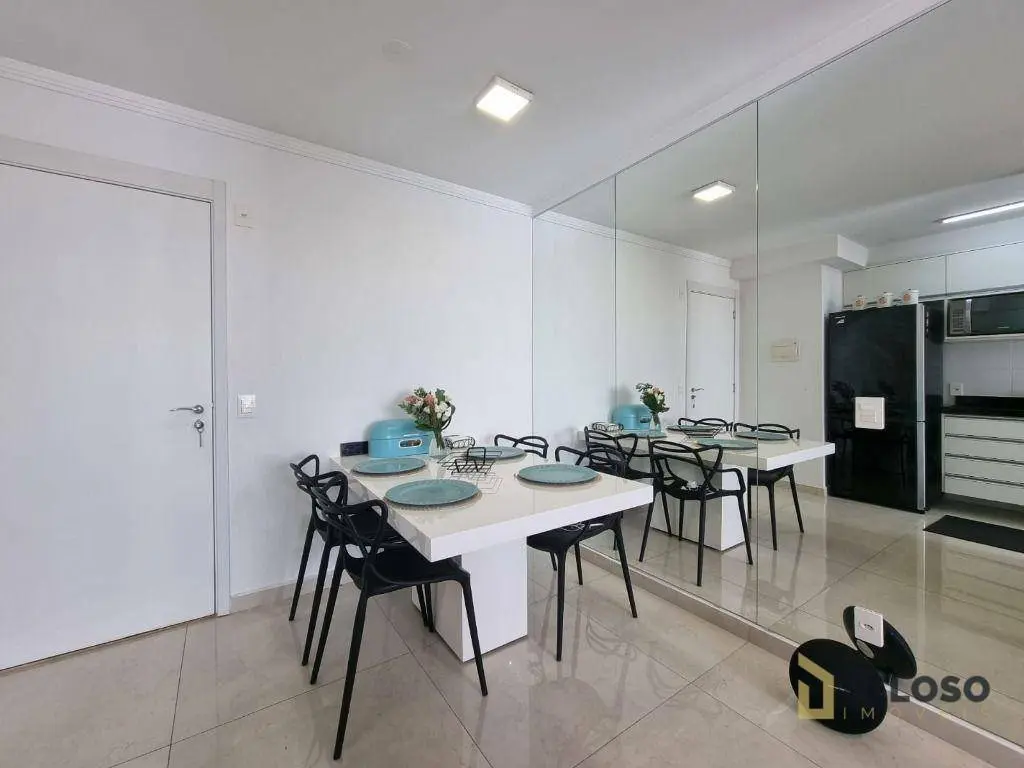 2 dormitórios com armários sendo 1 suíte, banheiro social, sala para 2 ambientes, varanda gourmet, cozinha equipada com forno, cooktop e armários, área de serviço e 1 vaga de garagem fixa.