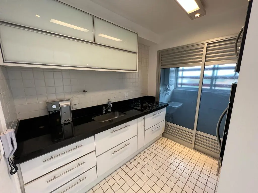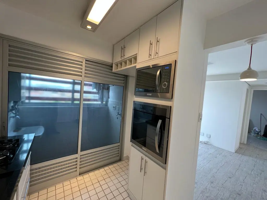 Apartamento reformado de 66 m2 com 2 dormitórios, sendo 1 suíte com ar condicionado, todos com armários, cozinha planejada com armários, cooktop, forno embutido, microondas, sala para 2 ambientes com ar condicionado, varanda espaçosa, banheiro social com gabinete, área de serviço e aquecedor a gás.