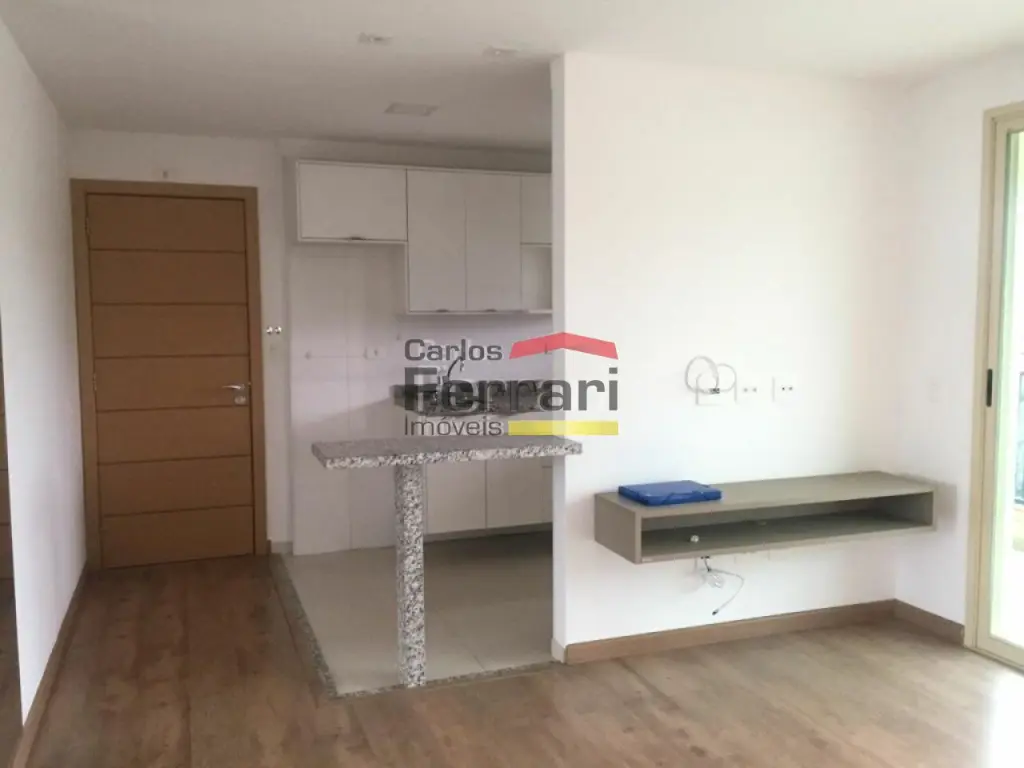 Apartamento com cozinha americana, armários embutidos novos, painel de TV, dormitório amplo, banheiro com box e ducha, iluminação em LED e varanda.