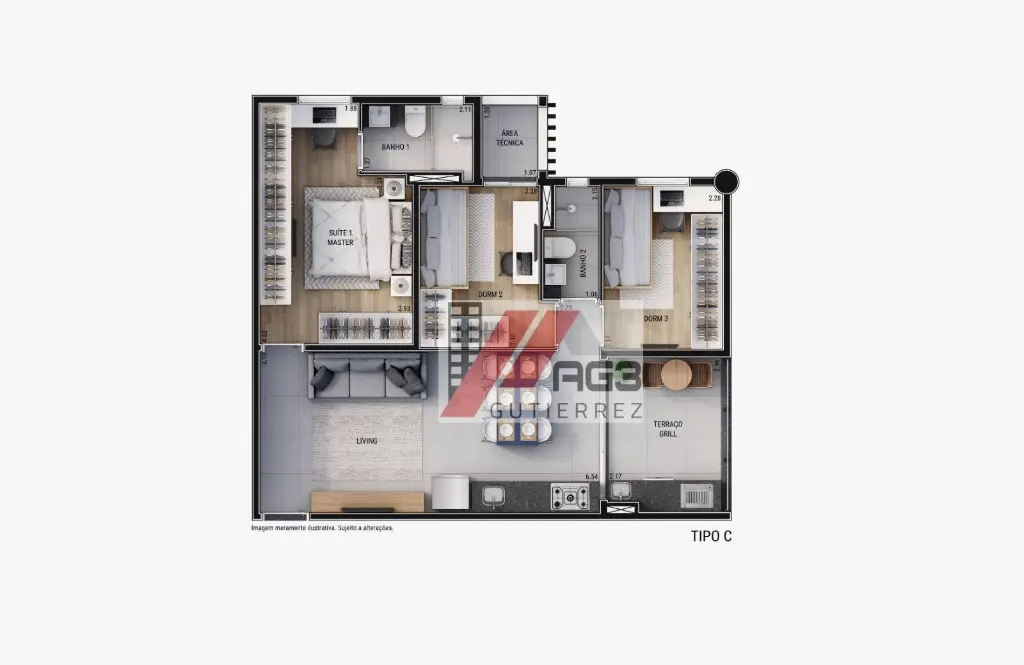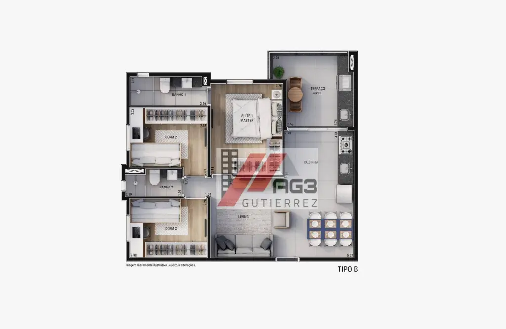 Esse apartamento possui uma planta 68m² distribuídos em 3 dormitórios, sendo uma suíte master, um banheiro social que serve os 2 dormitórios, amplo living para 2 ambientes, uma espaçosa varanda gourmet e duas vagas de garagem vinculadas e cobertas (sem sorteio e manobras de carro de vizinhos). A cozinha já integrada com a estrutura da sala e área de serviço completam o espaço interno. Os apartamentos serão entregues com a estrutura de automação para Alexa que podem ser usados para as lâmpadas, persianas e eletrodomésticos e também possuem toda estrutura para receber a instalação de ar-condicionado em todos ambientes e aquecimento de água a gás.
