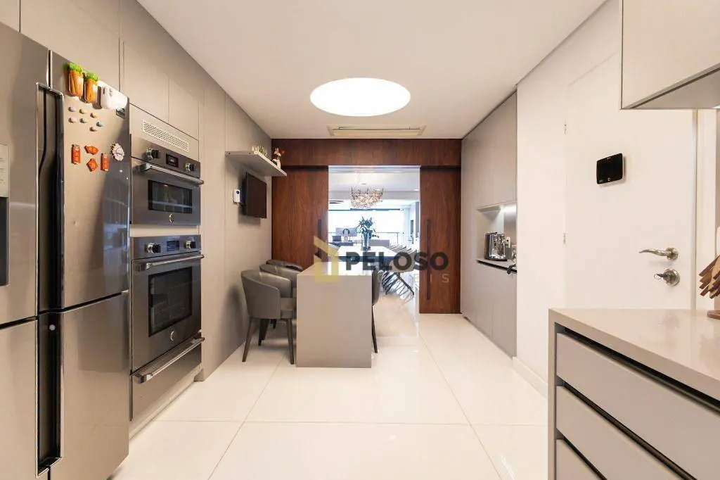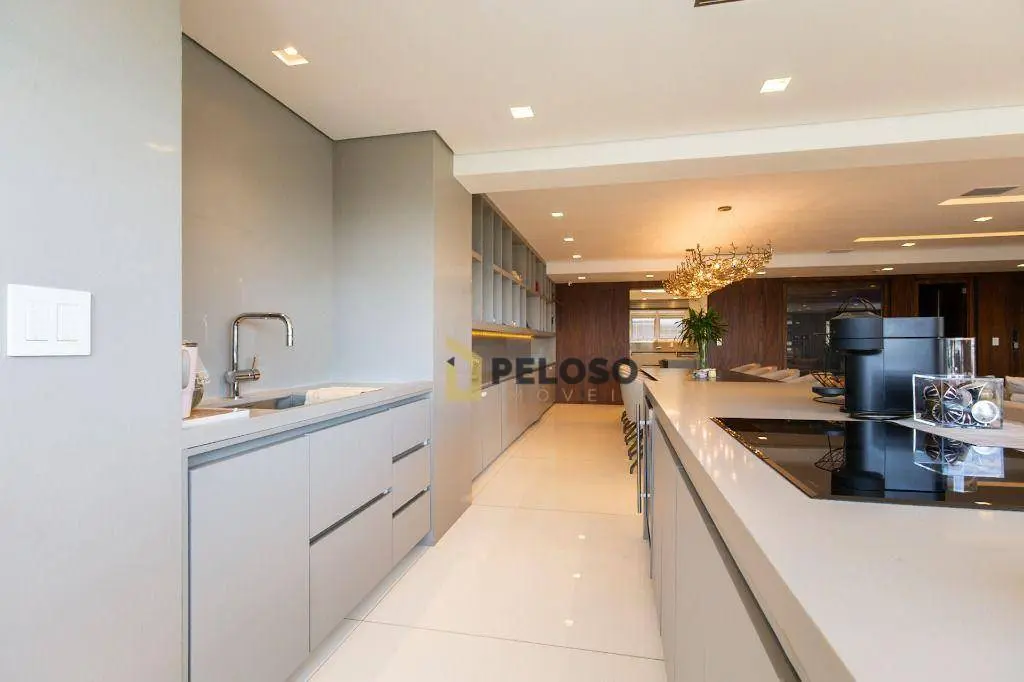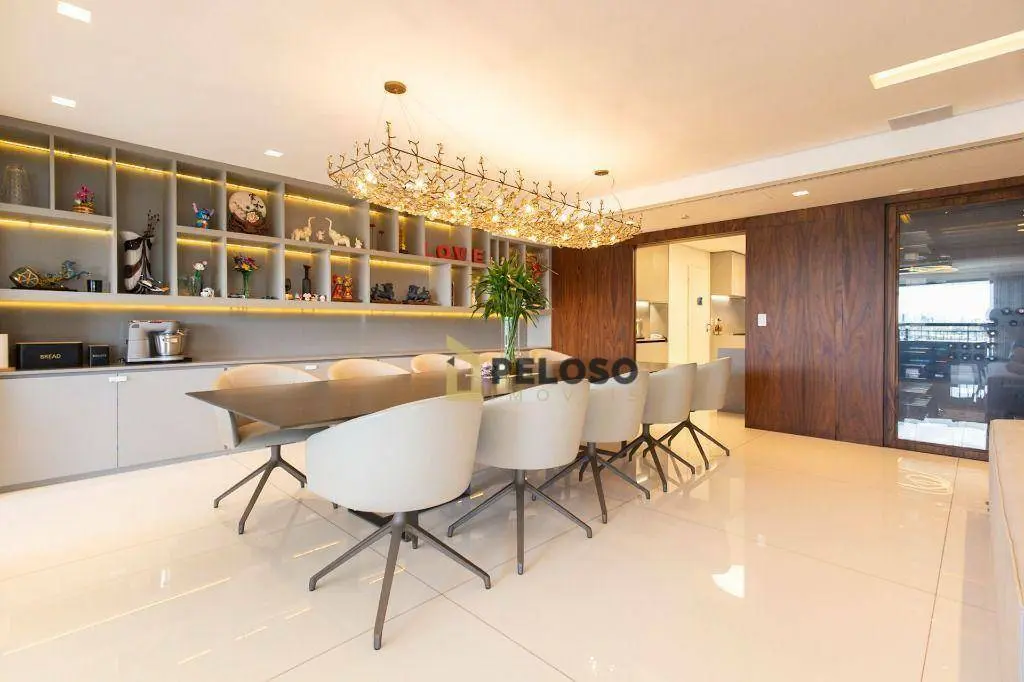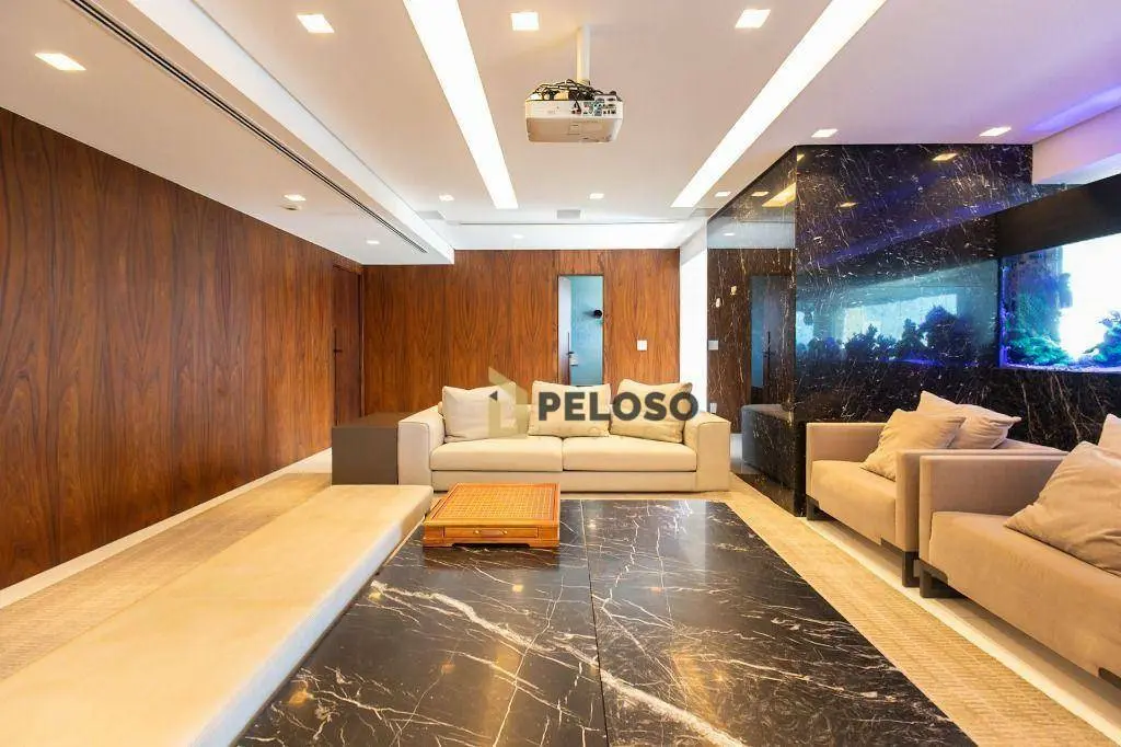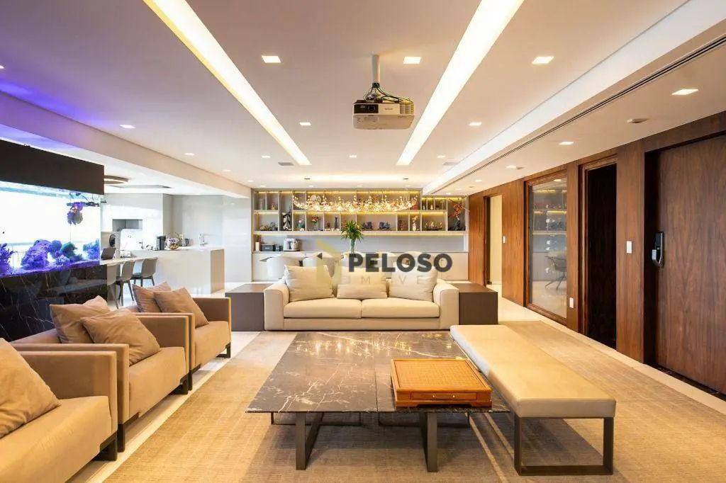 4 suítes sendo 1 suíte master com amplo closet e terraço, amplo living para 3 ambientes, terraço gourmet com churrasqueira, lavabo, copa, cozinha, área de serviço e quarto e banheiro de funcionária.