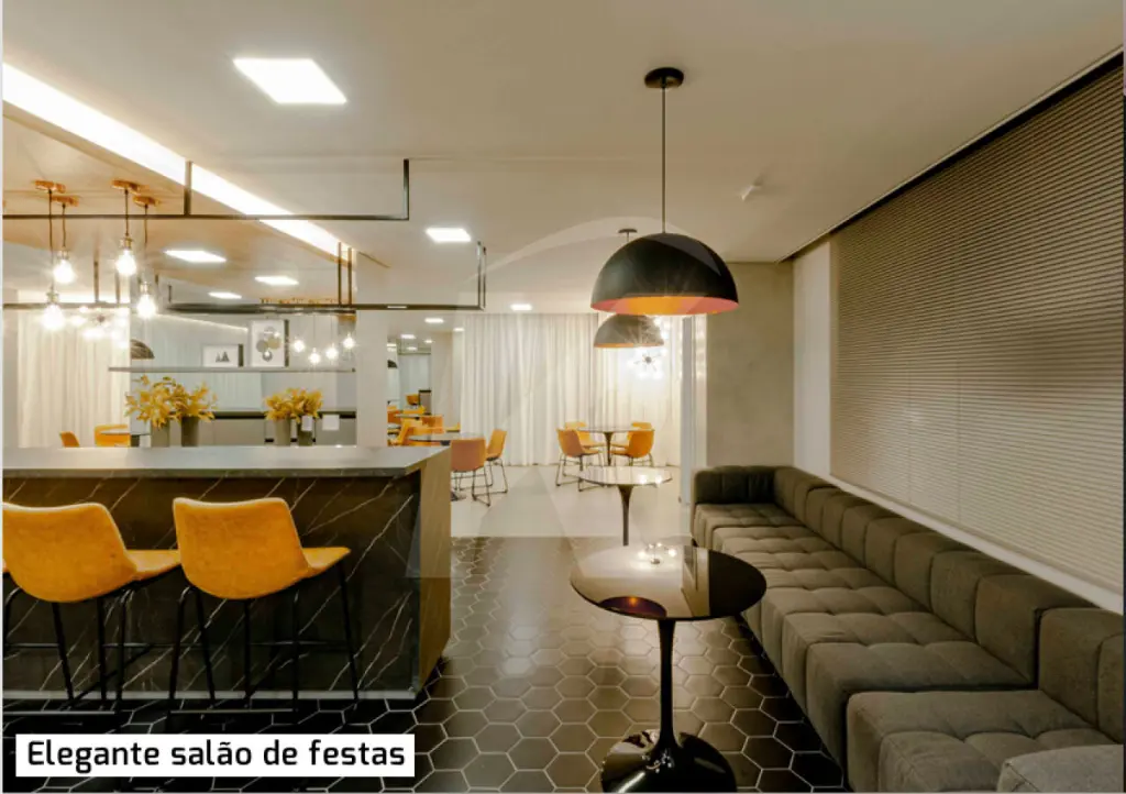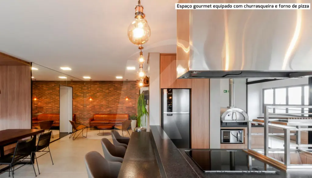 Salão de festas com espaço gourmet equipado