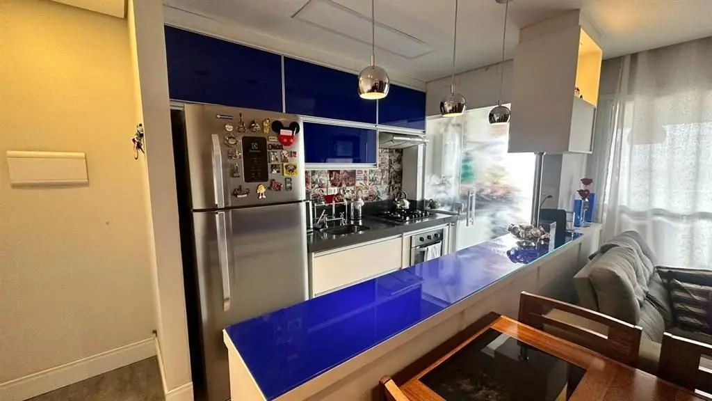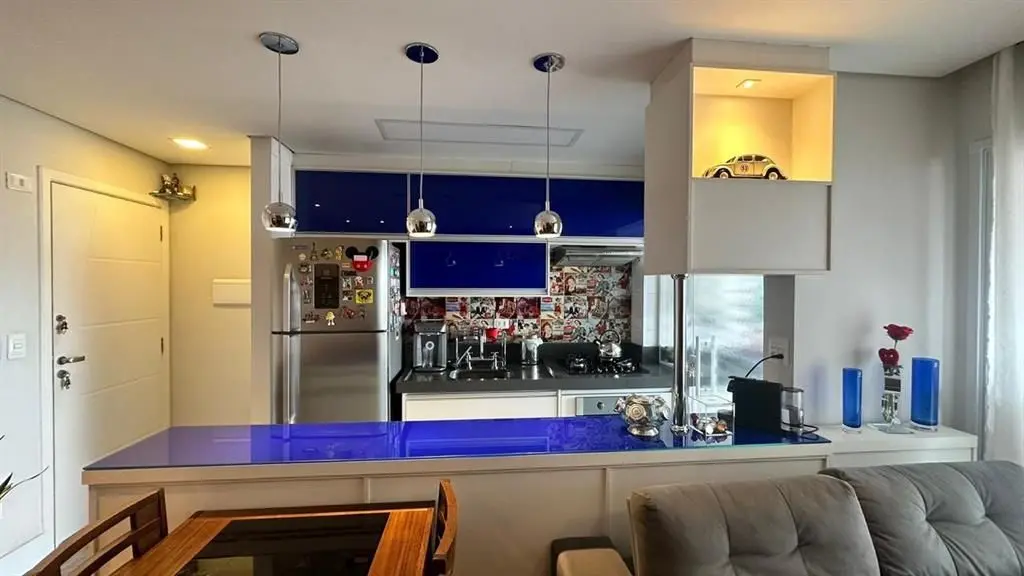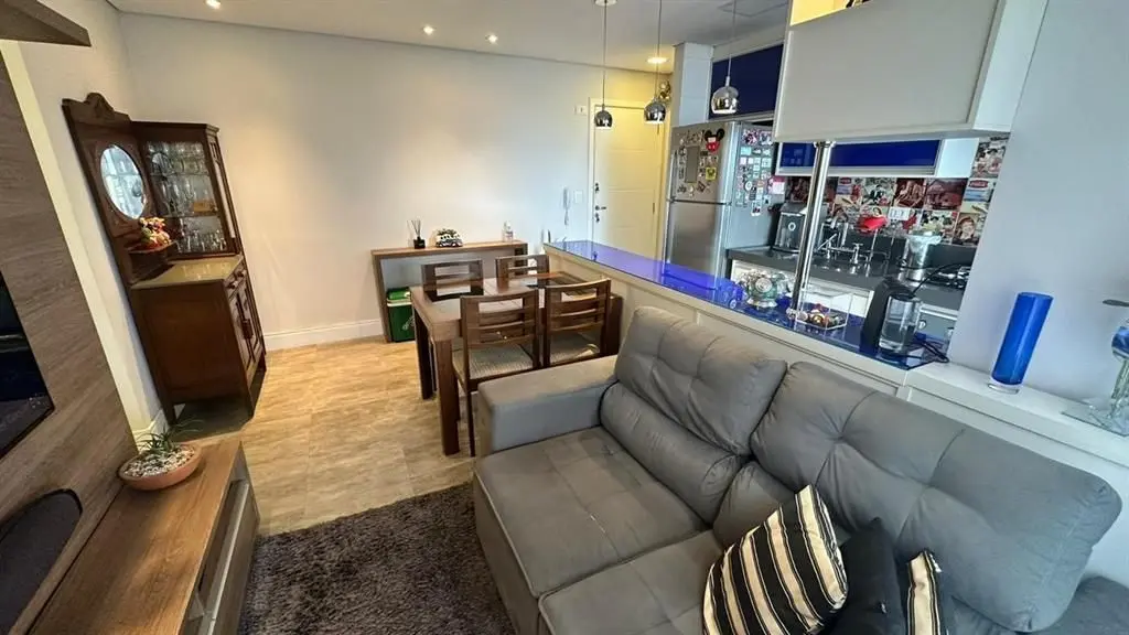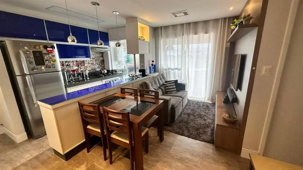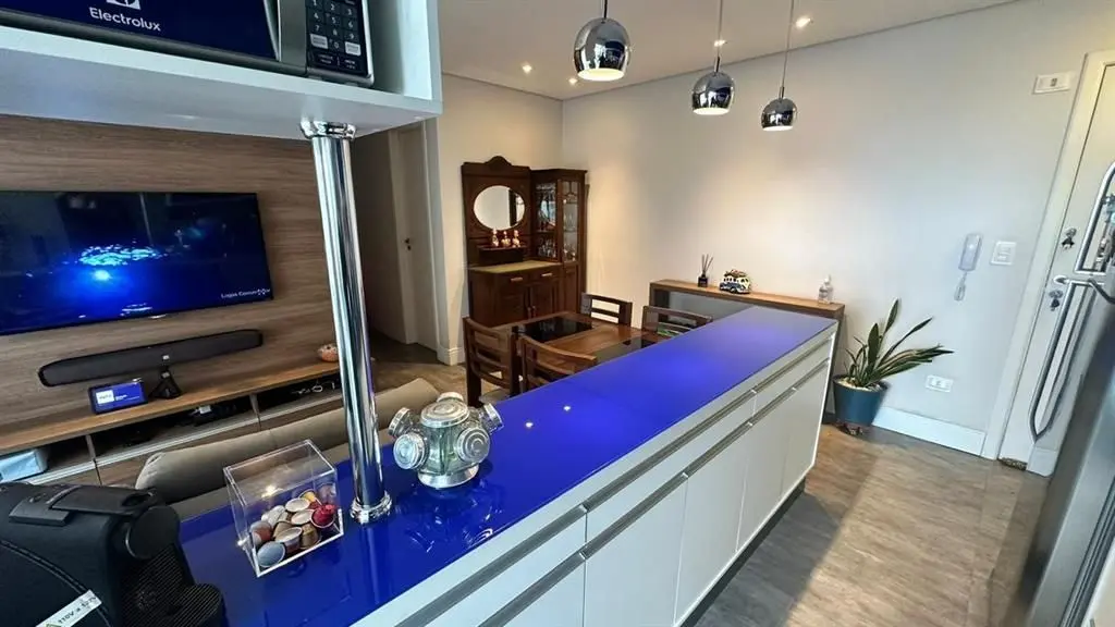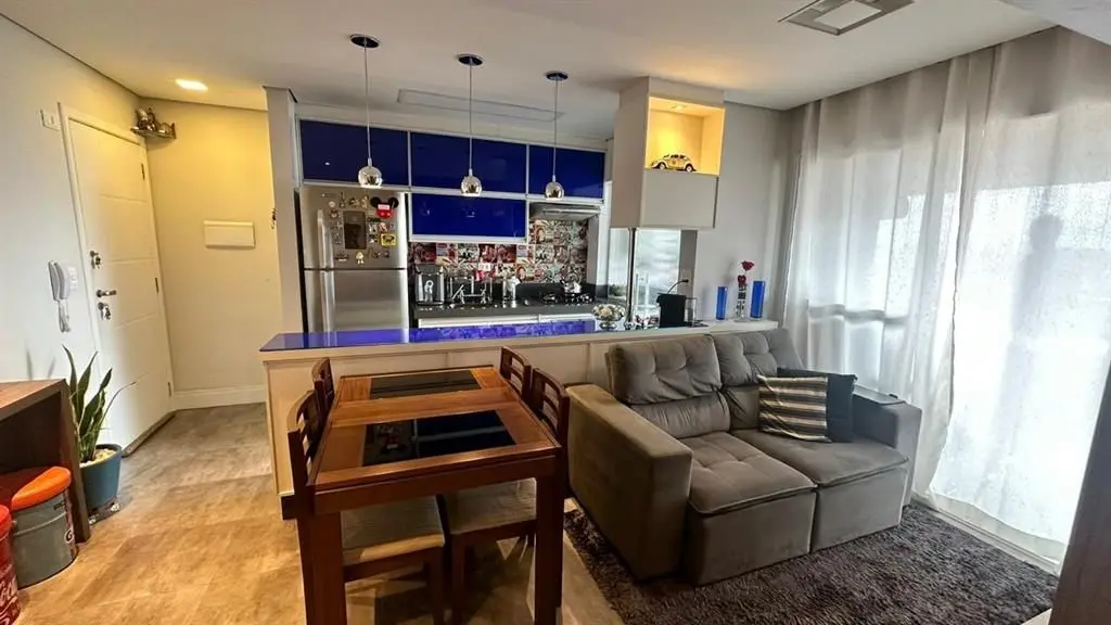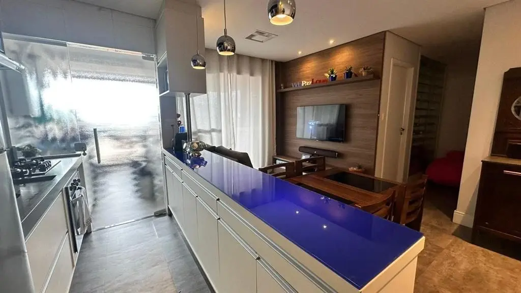 O imóvel dispõe de 2 dormitórios, sendo 1 suíte, living para dois ambientes integrado à varanda gourmet, que possui fechamento em vidro e churrasqueira. A cozinha é no estilo americano, totalmente planejada, e o apartamento conta ainda com iluminação automatizada em todos os ambientes, banheiro social e área de serviço.