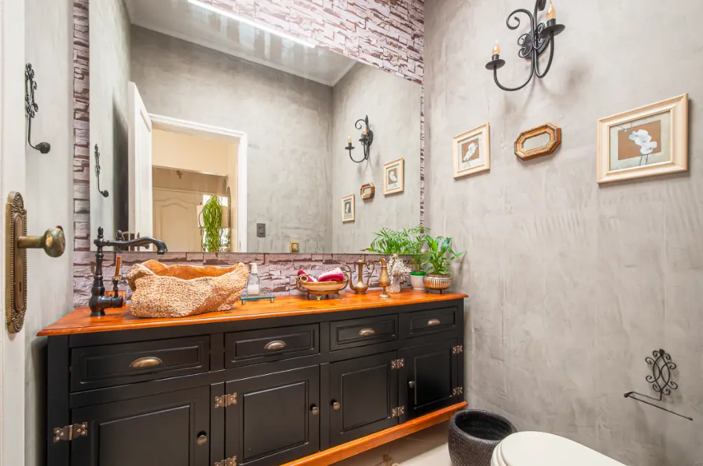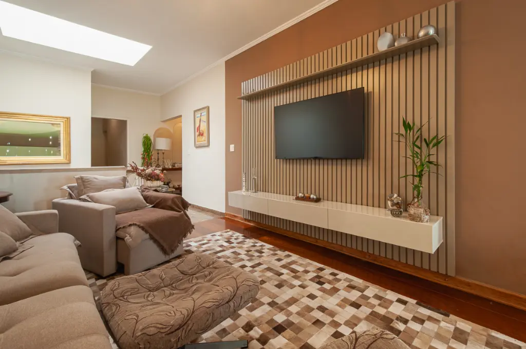 No Nível 1, um hall de entrada coberto dá as boas-vindas e conduz ao lavabo com pia suspensa e acabamento refinado. A sala ampla com três ambientes estar, jantar e lareira apresenta piso em madeira e porta de vidro que se abre para o jardim e quintal, proporcionando excelente integração entre os espaços internos e externos.
