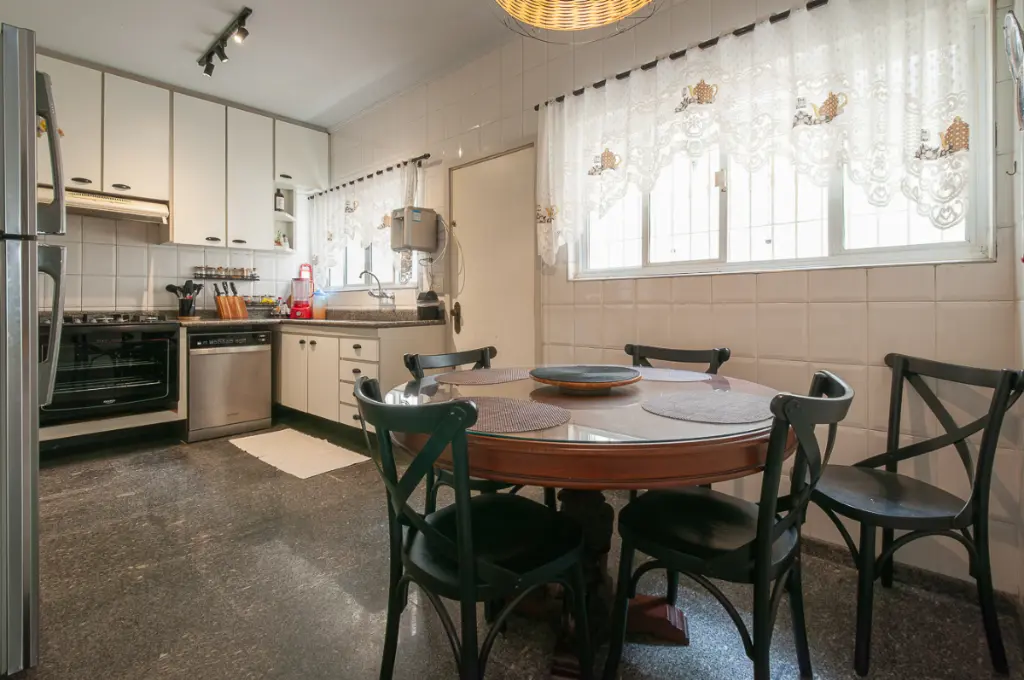 A cozinha, com piso em granito, ampla e bem iluminada, conta com armários planejados e espaço funcional para o dia a dia. Nos fundos, a área de serviço é completa, com dependência de empregada e banheiro, além de acesso à agradável área gourmet, equipada com churrasqueira e pia, ideal para momentos de lazer e convivência.