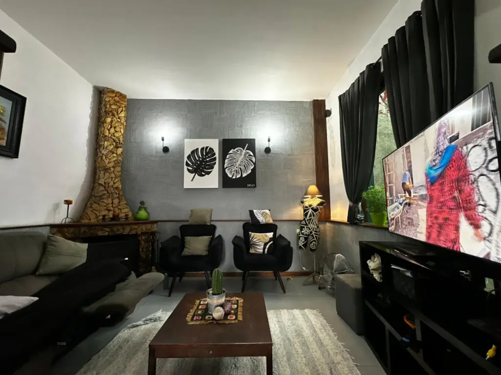 ? Sala de 2 ambientes, com lareira;