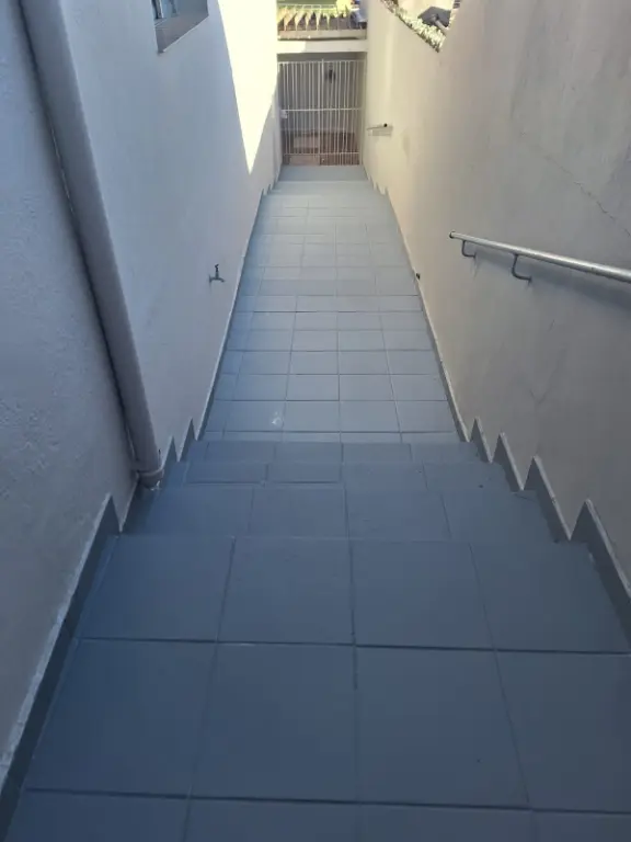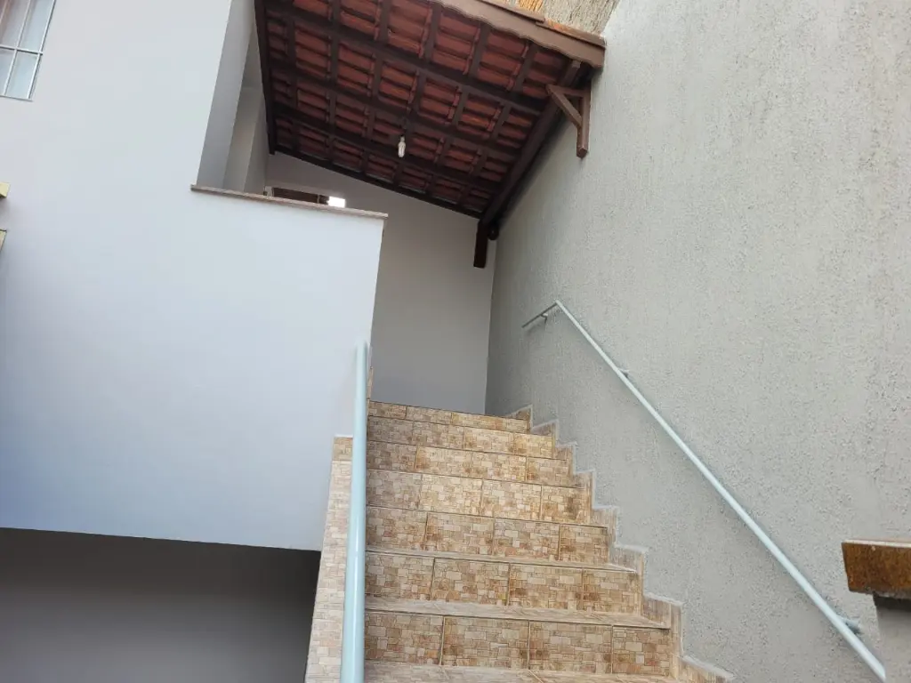 Escadas de acesso, pois a casa fica acima do nível da rua toda térrea.