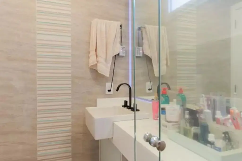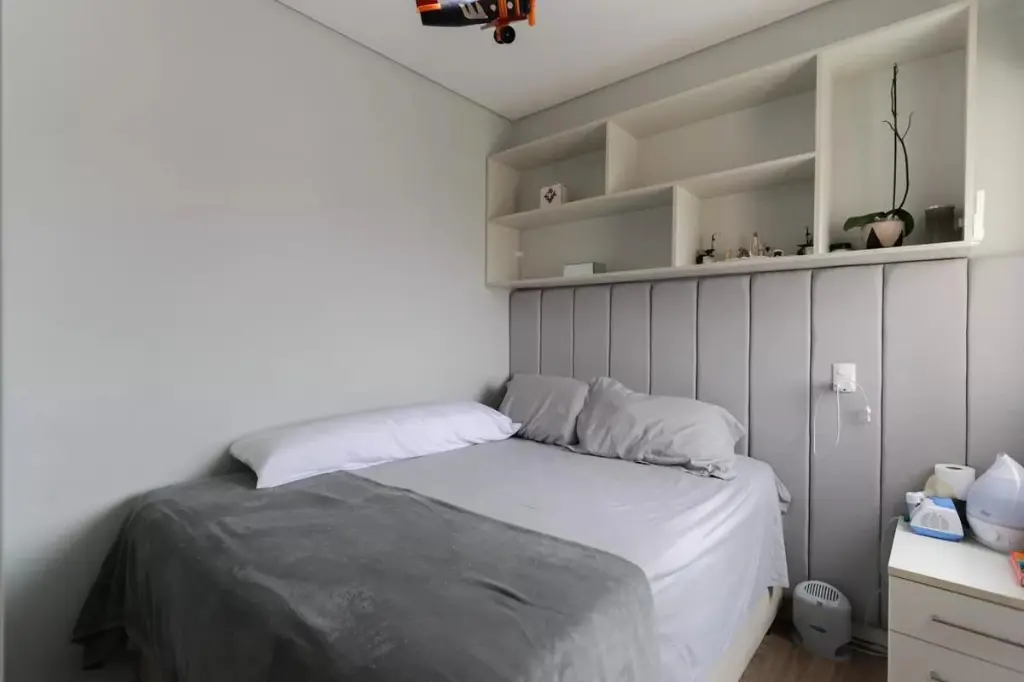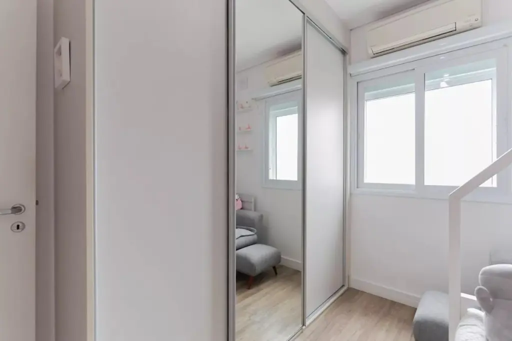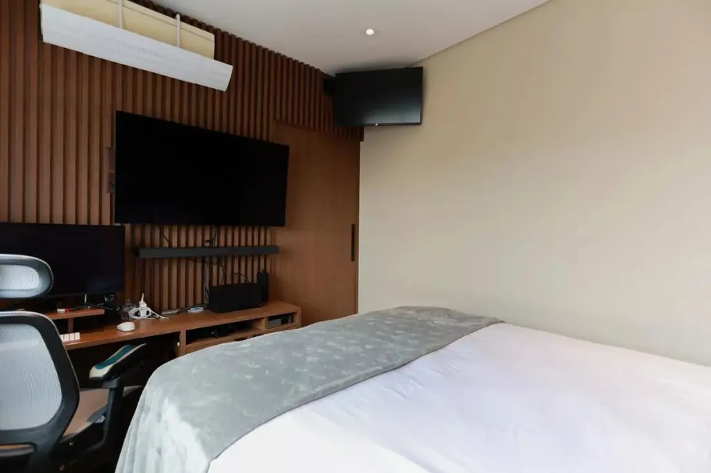 No pavimento inferior, a área íntima foi pensada para o dia a dia da família, com dormitórios bem distribuídos, boa entrada de luz natural e soluções que elevam o conforto, como persianas automatizadas, janelas antirruído nos quartos e ar-condicionado nos ambientes. A suíte principal reforça a proposta de bem-estar e privacidade, enquanto a marcenaria planejada valoriza funcionalidade e acabamento.