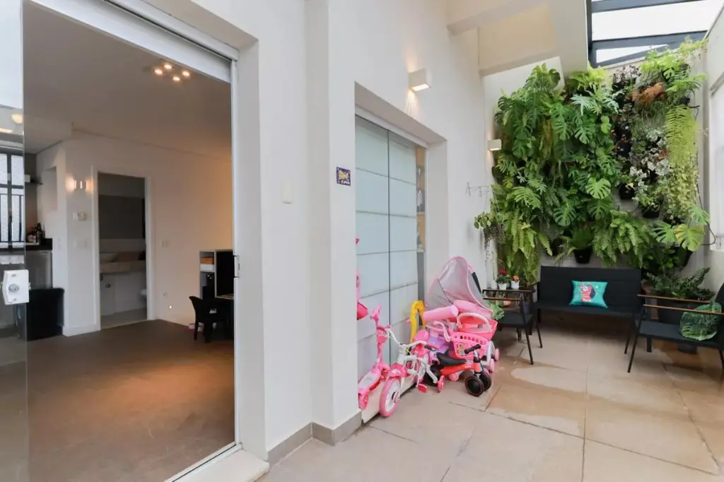 No pavimento superior, a cobertura ganha outra escala de uso. A sala de TV e jogos, integrada à área gourmet com churrasqueira, cria um ambiente perfeito para receber com mais liberdade. A área externa é um dos grandes diferenciais do imóvel, com piscina aquecida privativa, deck reformado e jardim vertical, compondo um cenário raro para quem busca uma cobertura que realmente ofereça lazer dentro de casa.