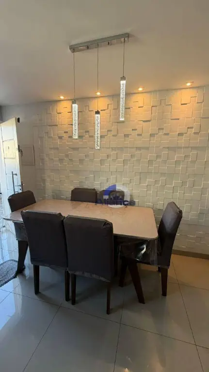 Lustre e spots decorativos na mesa de jantar.