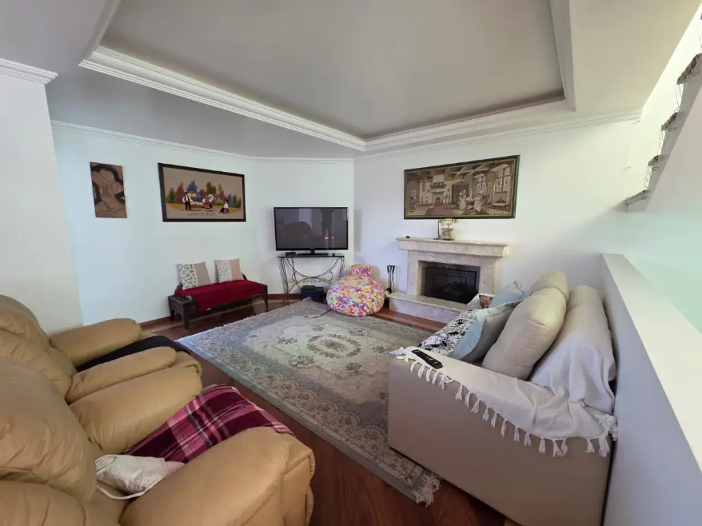 Sala com 3 ambientes integrada à varanda e lareira
