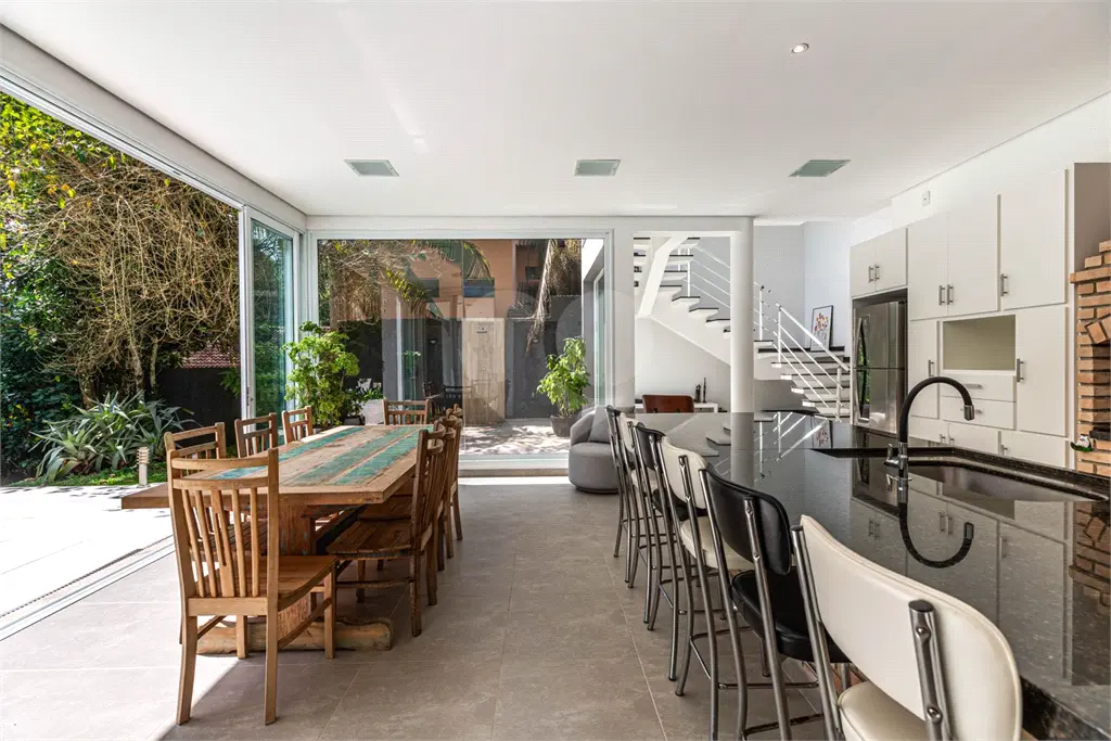 Ainda neste piso, contamos com lavabo, cozinha com dispensa que possui uma porta divisória de três folhas em madeira maciça que separa a cozinha dos ambientes sociais, como se trata de uma porta divisória, é possível deslizá-la e integrar à área social.