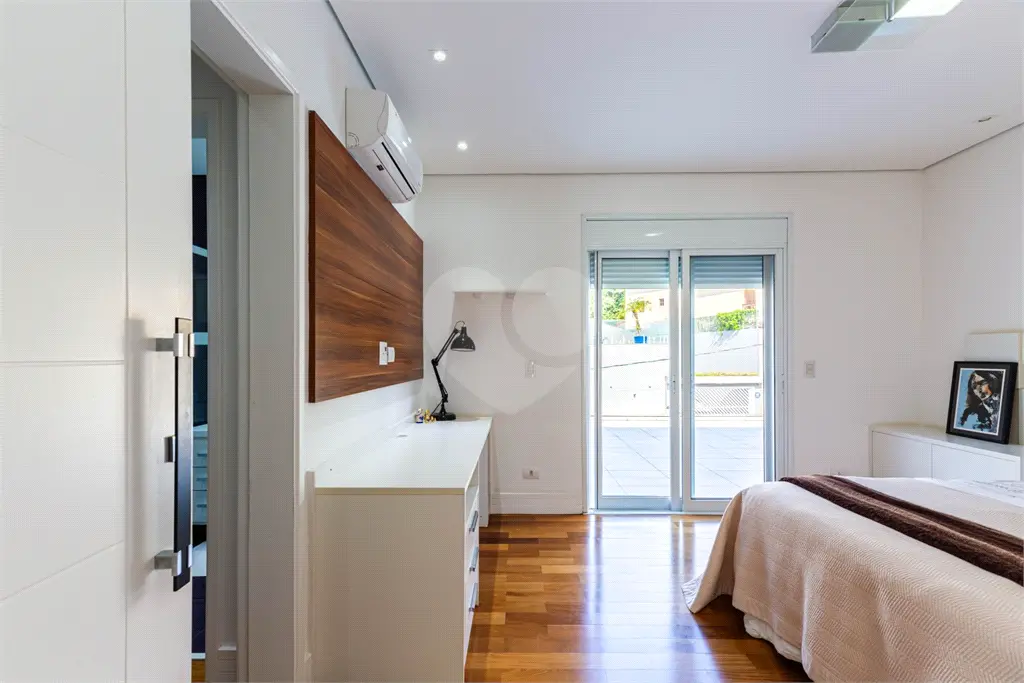 A casa dispõe de cinco quartos, sendo três amplas suítes com ar-condicionado, cada uma com seu próprio walk-in closet e varanda. Um quarto na área da piscina com banheiro e um quinto quarto com banheiro de serviço - hoje sendo utilizada como deposito.
