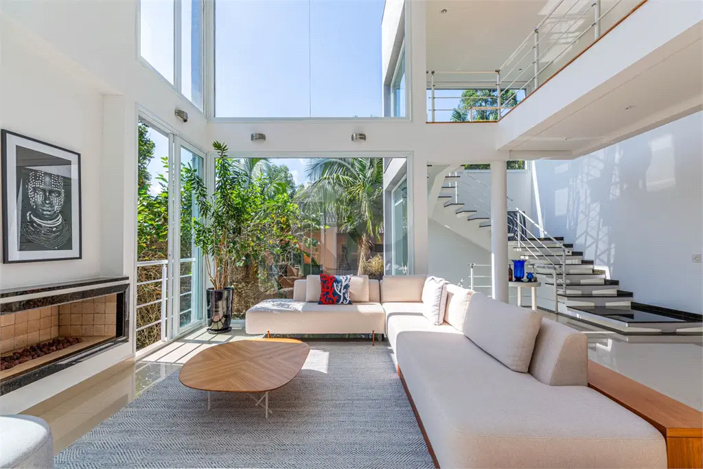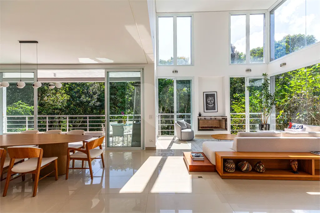 Um amplo living social com pé direito duplo de 6 metros, composto por três ambientes: Hall com espaço de descanso, sala de estar com lareira a gás, sala de jantar, varanda gourmet com churrasqueira - todos entregados e com vista para mata e para a piscina aquecida.