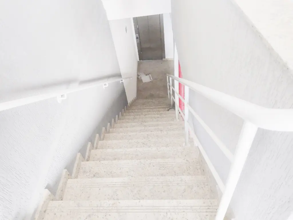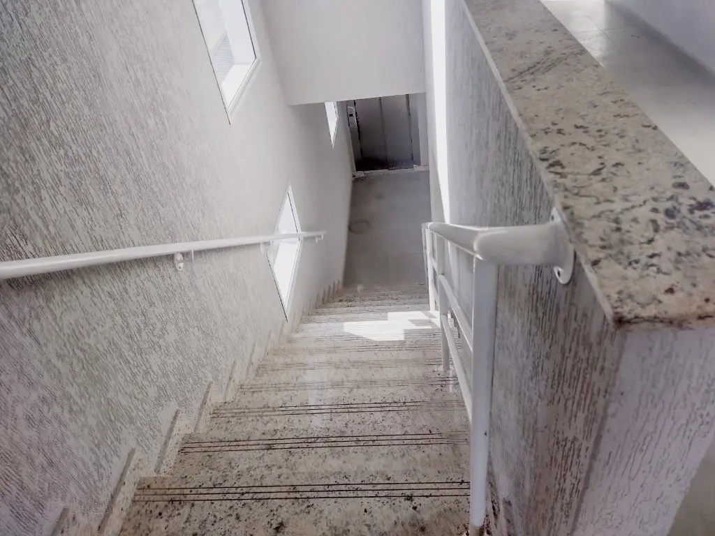 Elevador. Corredores e escadas largas.