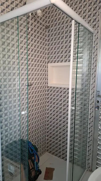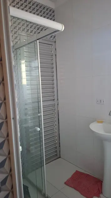 Salão com cozinha integrada e piso frio, terraço e banheiro azulejado com chuveiro.