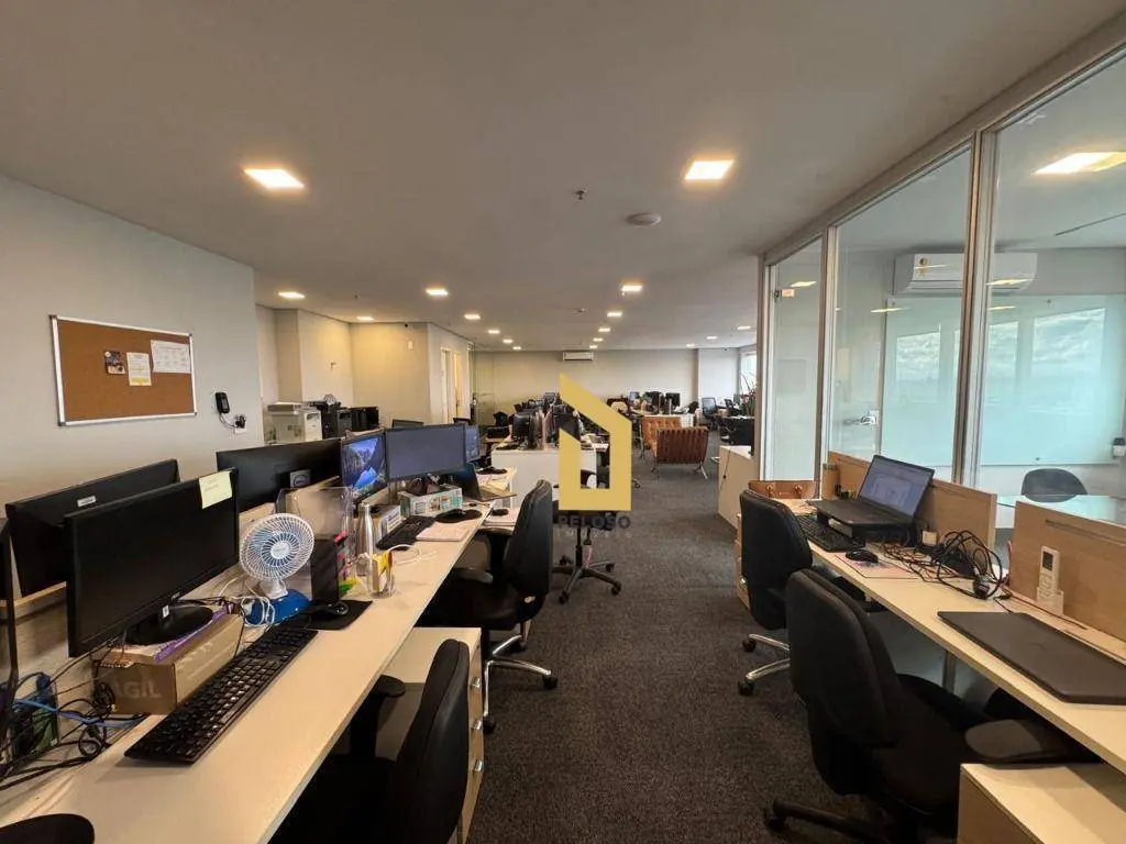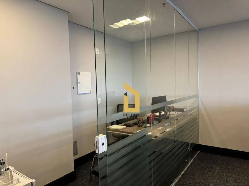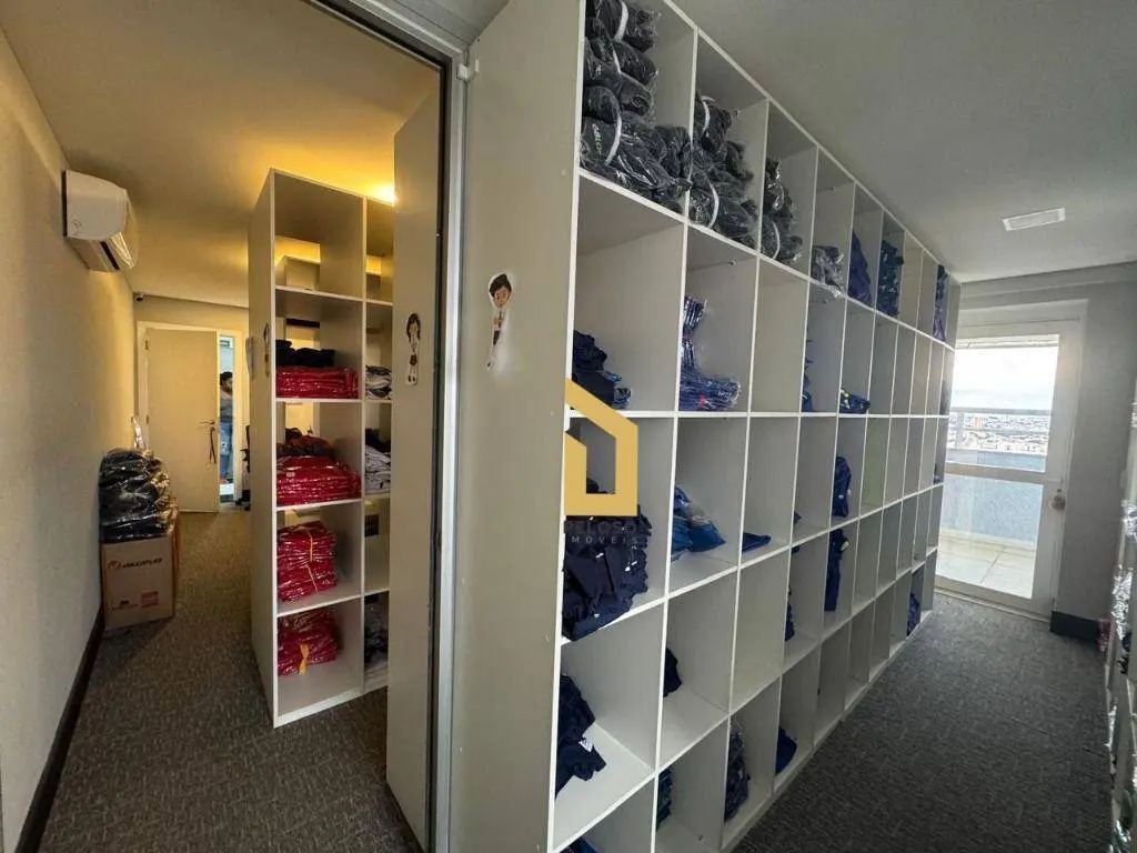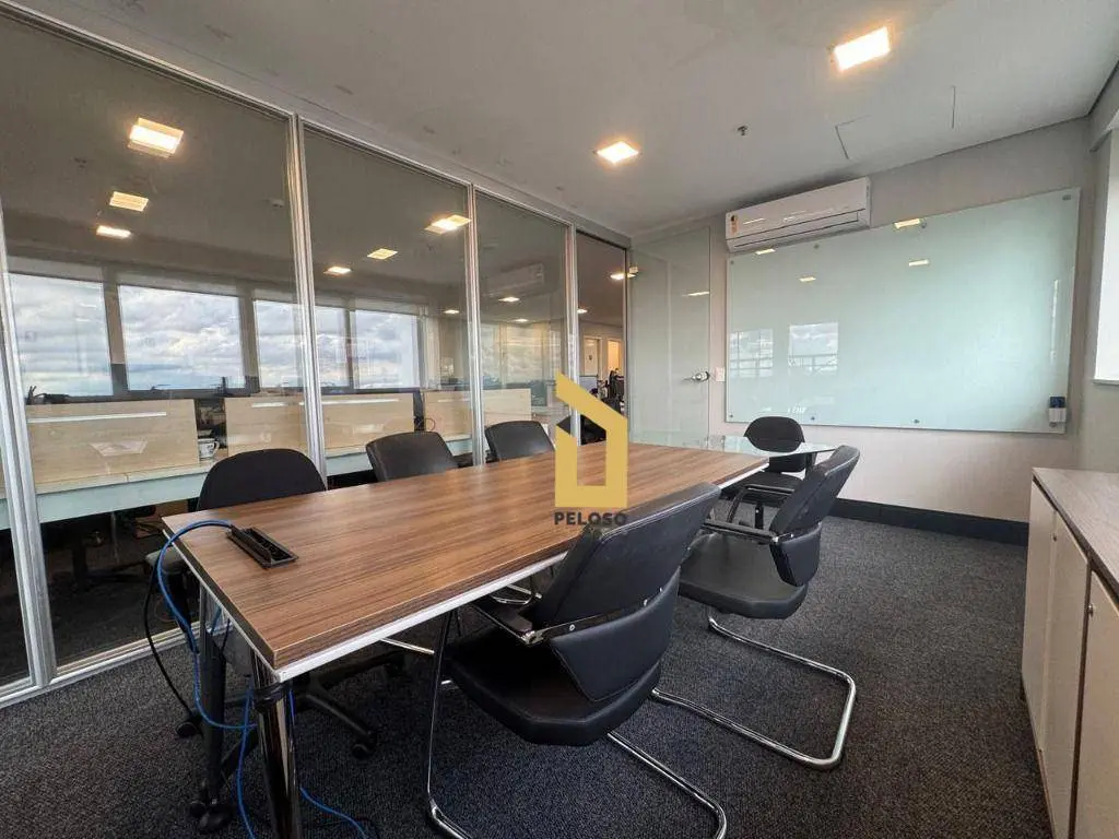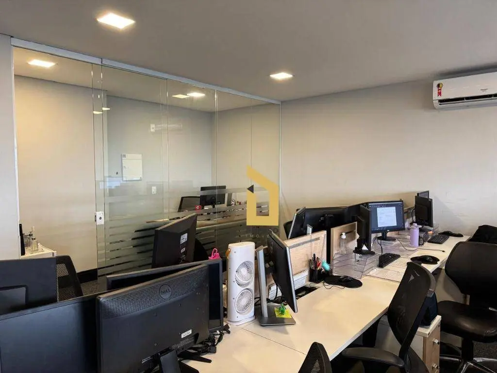 4 salas interligadas com copa, 5 banheiros, 2 varandas, piso elevado, teto, iluminação, ar-condicionado e mobília.